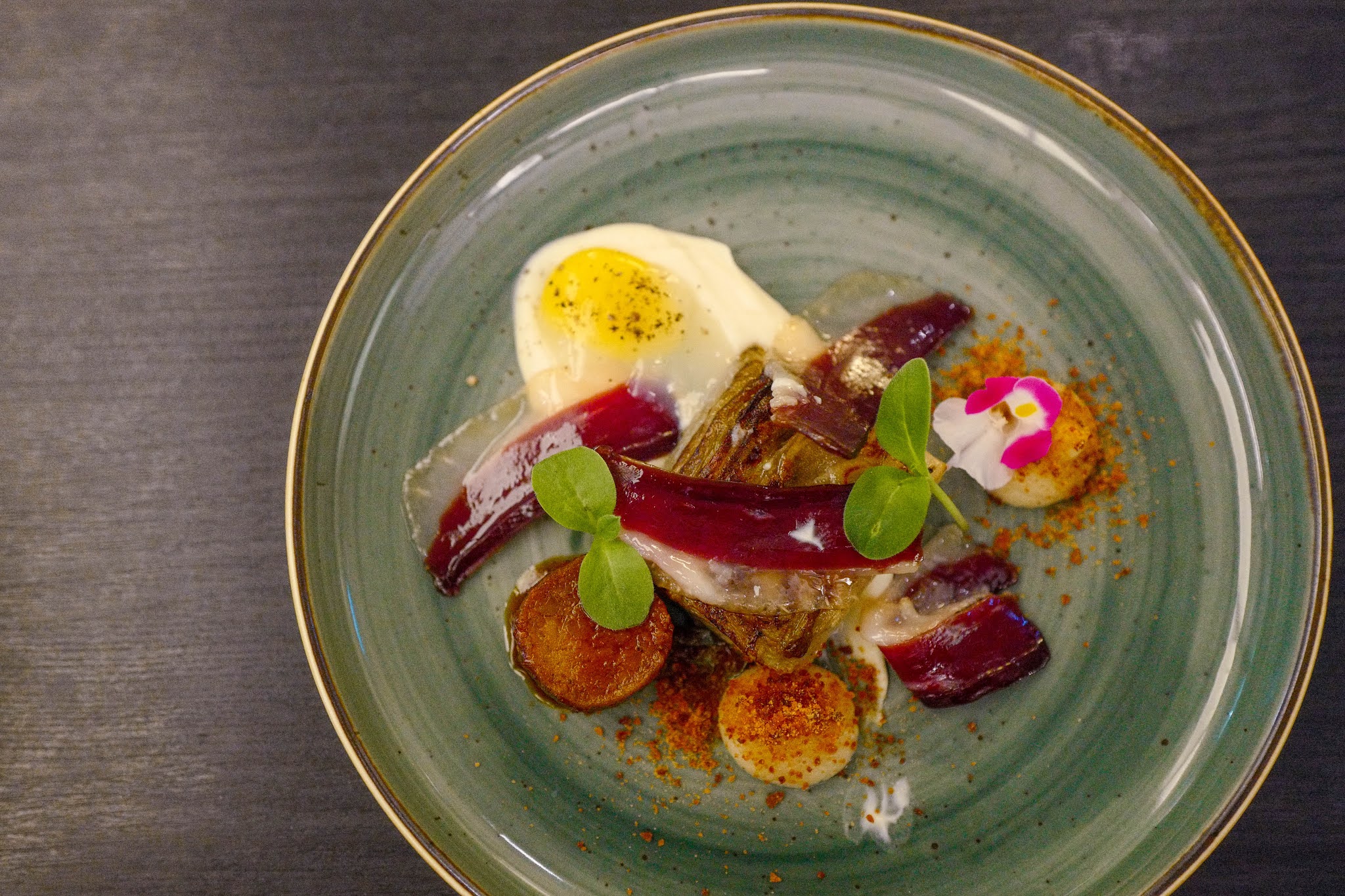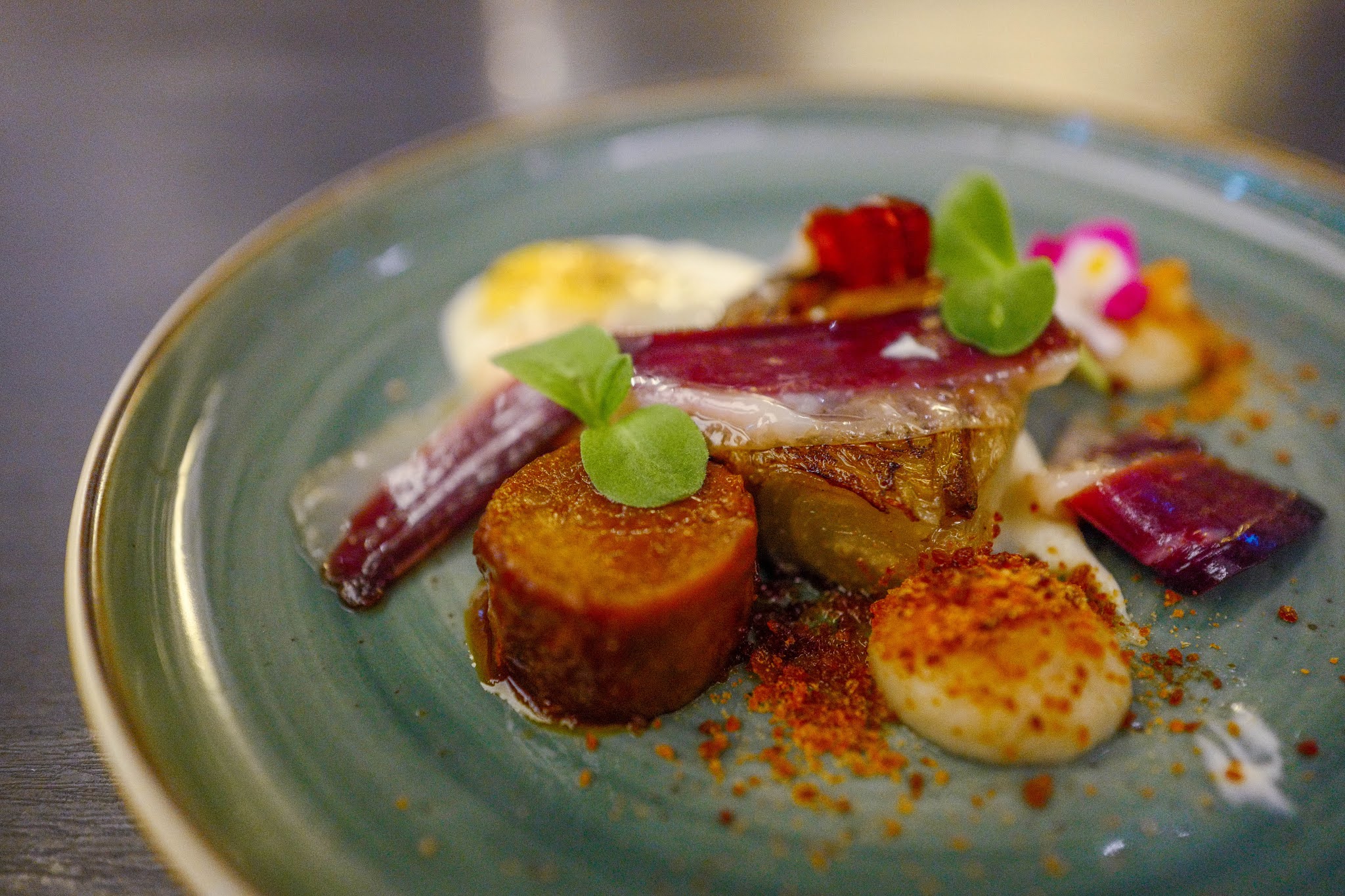 In the culinary equivalent of a top-tier squash championship, chef Evert rallied with his next offering, Belgian Endives and Ham, a personal staple of his younger years that he helped his mother cook each winter (endives used to be only available during colder seasons). Evert's pork-free rendition replaces conventional ham with Spanish cured duck ham (kept at room temperature to preserve its fattiness) and pork sausage with a vegan sausage, paired with braised endives and a light, bright cheese sauce. Rounded out with a puree of Jerusalem artichoke, a crumble of chorizo, and a slow-cooked quail egg, this is rich and robust, an elaborate ensemble that shows how a matured chef makes magic and works wonders with many ingredients on a single plate.