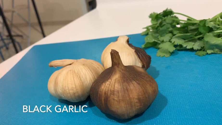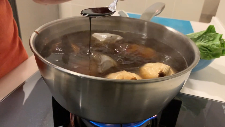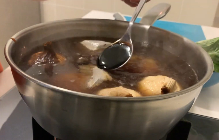 Add the bak kut teh herbs and spices, followed by the chicken drumsticks. Then add the whole black garlic. Add 1 tbsp of soy sauce, then 1 tbsp of caramelised soy sauce.