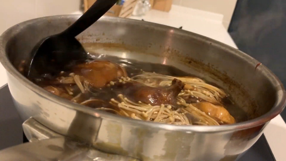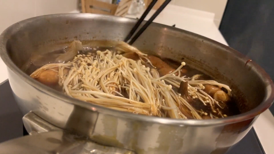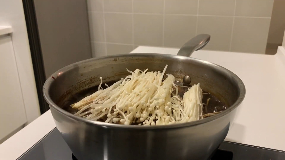 Mix it up and let it simmer for 45 minutes. Add in the enoki mushrooms on top, and you're almost done! Let it simmer for another 10-15 minutes, then it's ready to serve.