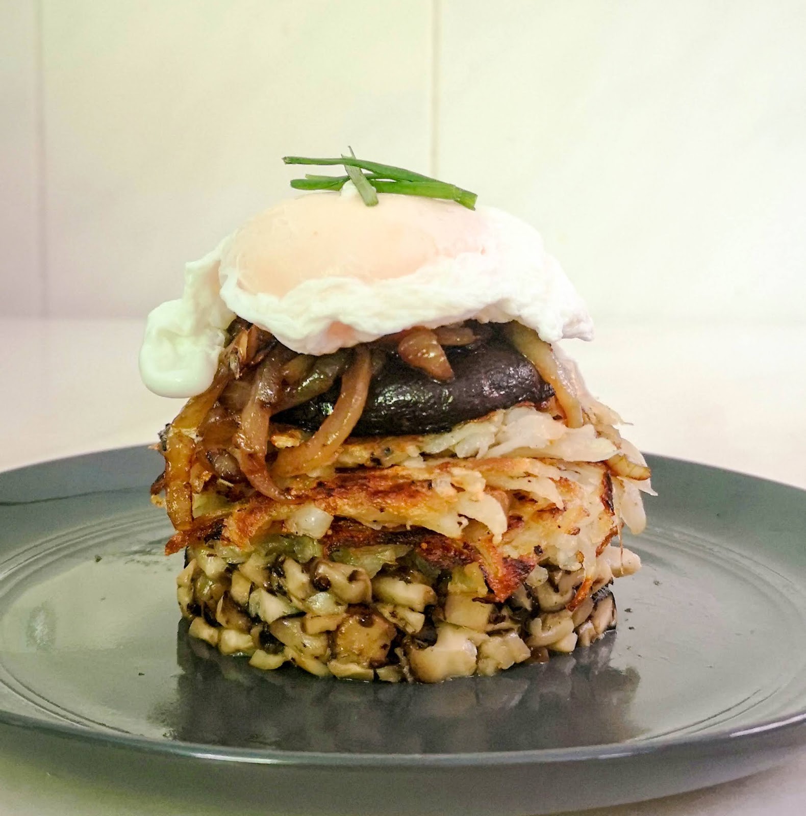 1. Place the mushroom duxelles on your plate and top up with the potato hash, whole mushrooms, caramelised onions and lastly, the poached eggs. I used a round cookie cutter to help get the
