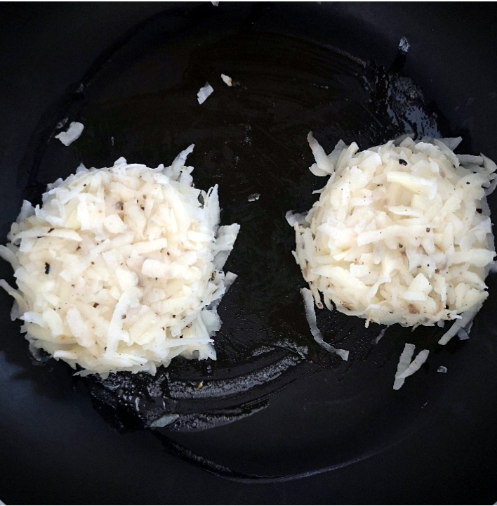 6. Add your two potato patties and fry until golden brown on each side. This will take about 15-20