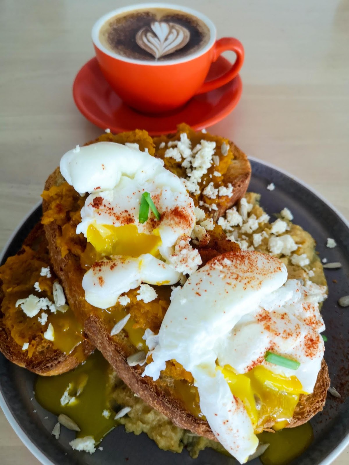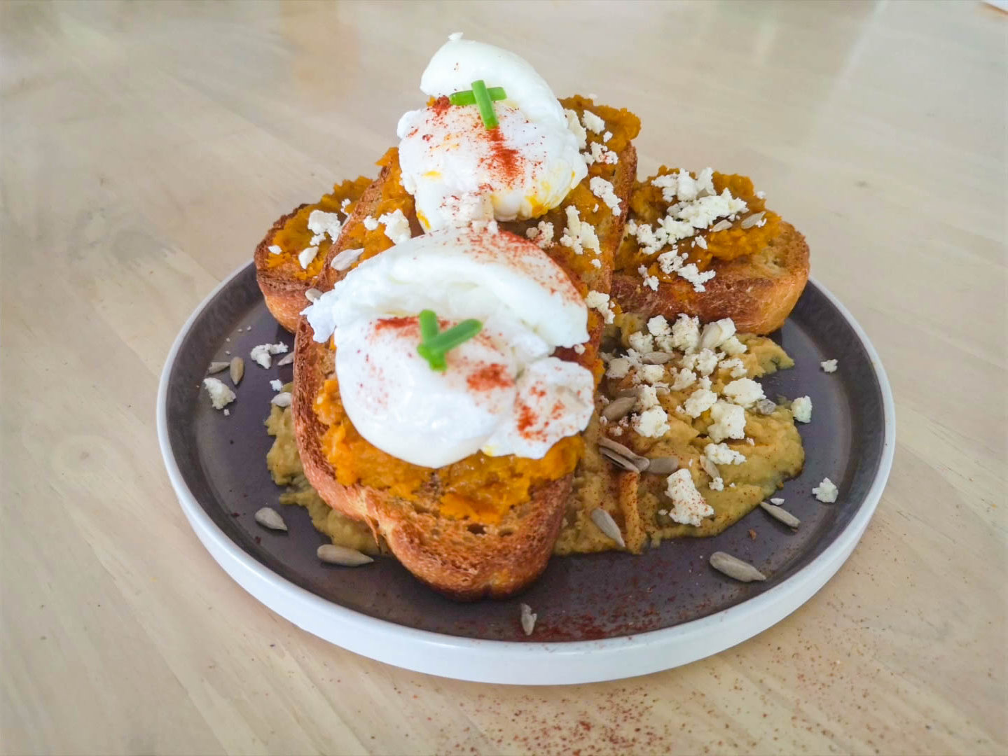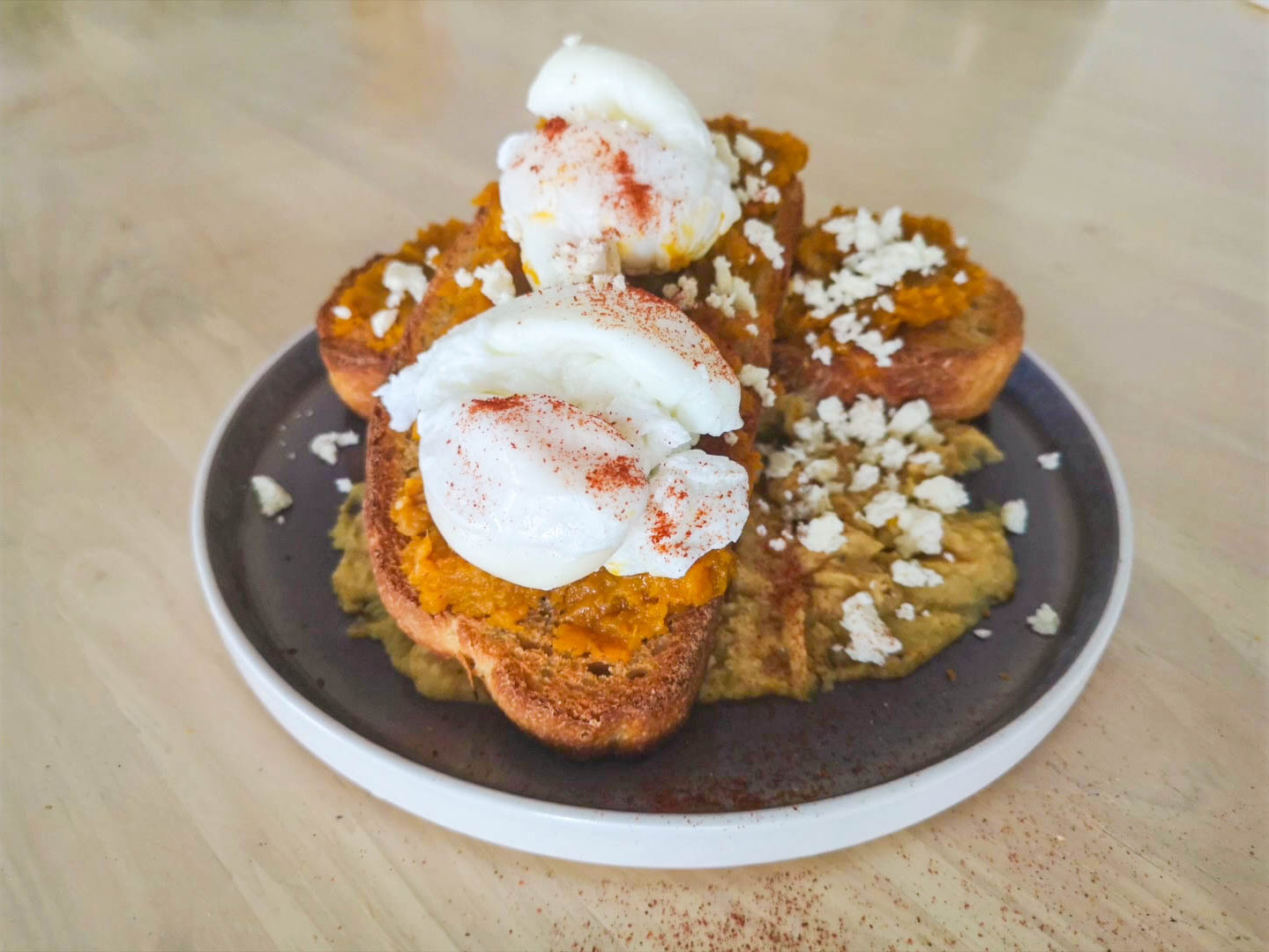 3. Carefully place the poached eggs on top of the mashed pumpkin.