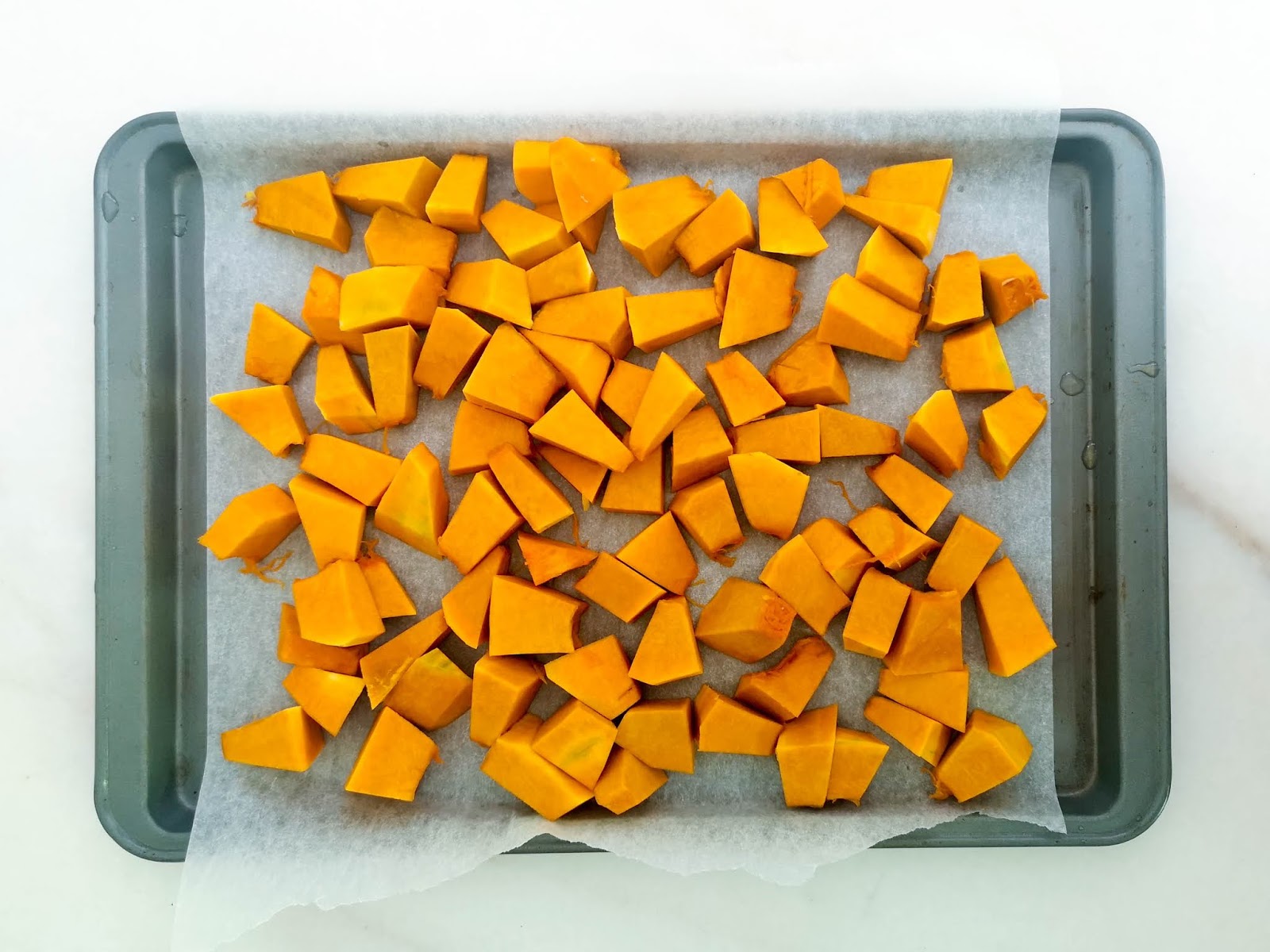 2. Cut the pumpkin into small pieces and lay them on a baking tray.