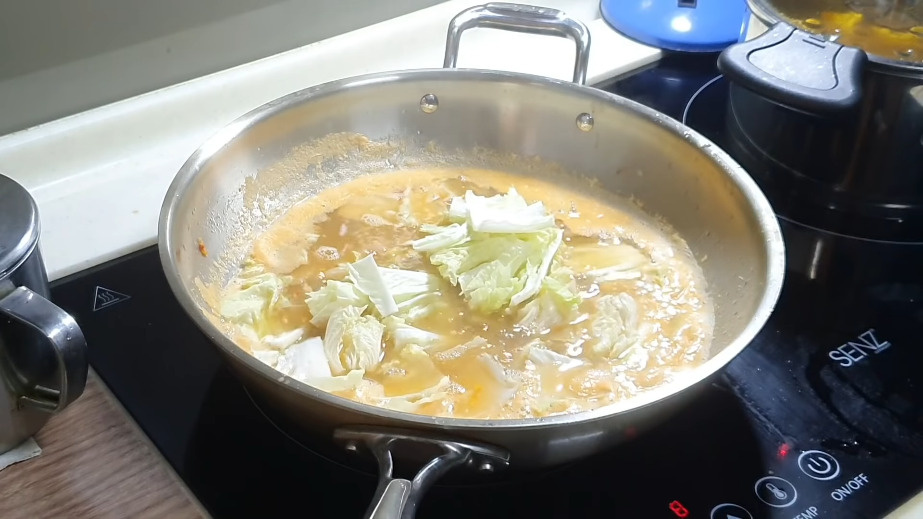 Add about 2 tbsp of soya sauce, then some fish sauce, followed by a bottle cap's worth of Shaoxing wine. Bring everything to a boil.