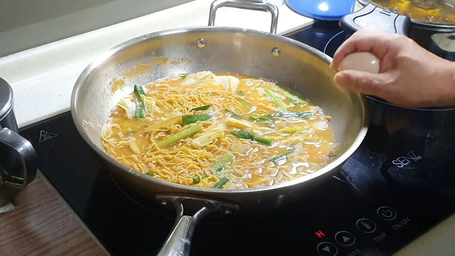 Turn off the fire. Mix 2 or 3 tbsp of corn starch with twice the amount of water, then slowly add it to the wok. Add enough starch to get your preferred consistency; Ah Pa likes it thick, so he adds a second portion. After you have enough, crack an egg into the wok.