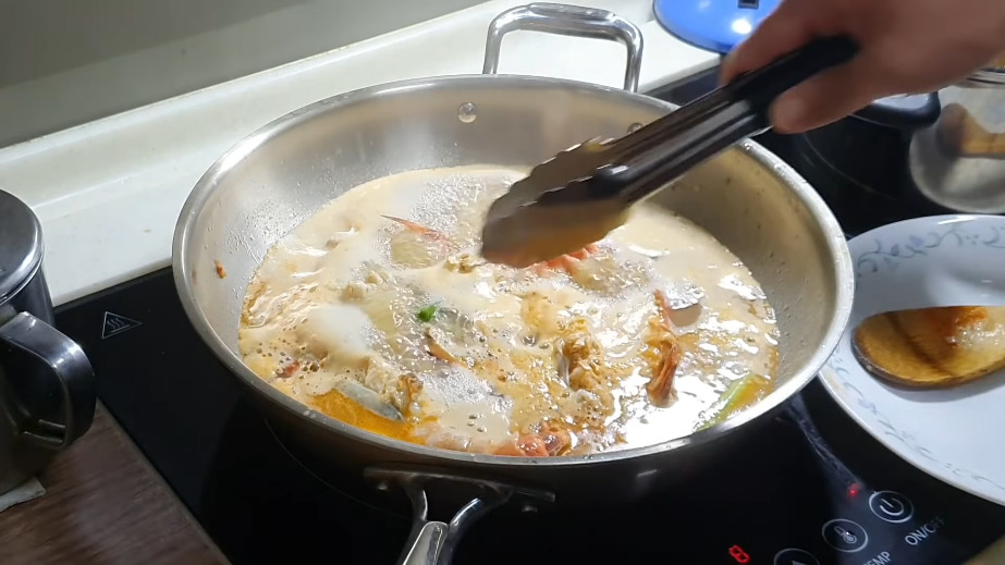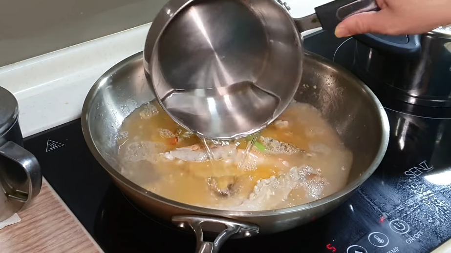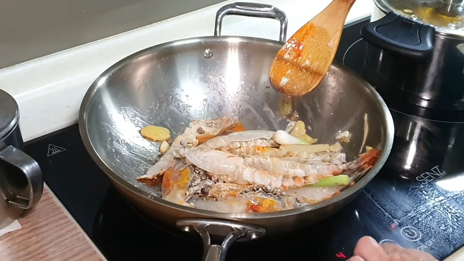 Once the fragrance is released, add the prawns. Stir-fry for a bit, then add the pork or chicken stock broth as well as hot water.