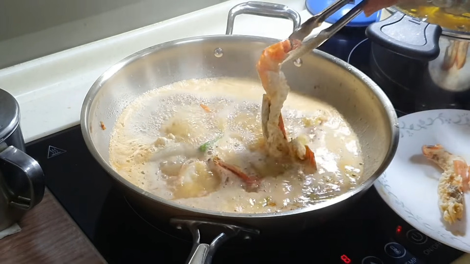 Once the base boils, it should turn orange thanks to the prawn tomalley. Take out the prawns, which should be white and cooked.