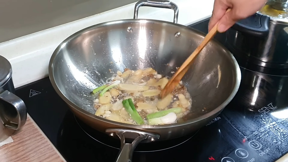 Begin with the base by pouring peanut oil on the wok, plus the lard and crackling if you have them. Add the ginger, garlic and white parts of the spring onions; saute for about a minute.