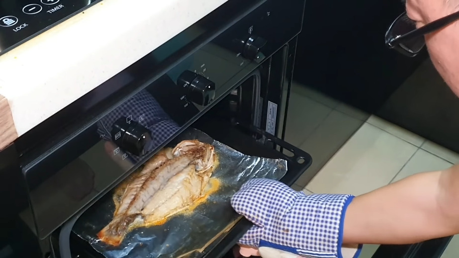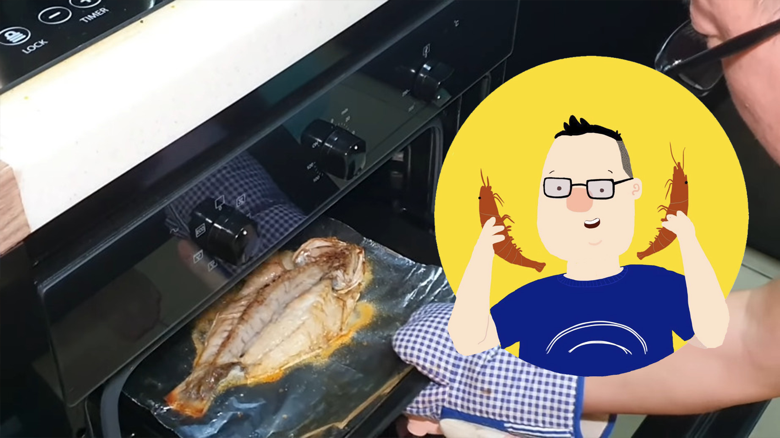 Now put it in the oven for between 15 to 20 minutes, his estimate for a 500g fish. Larger fish might take more time.