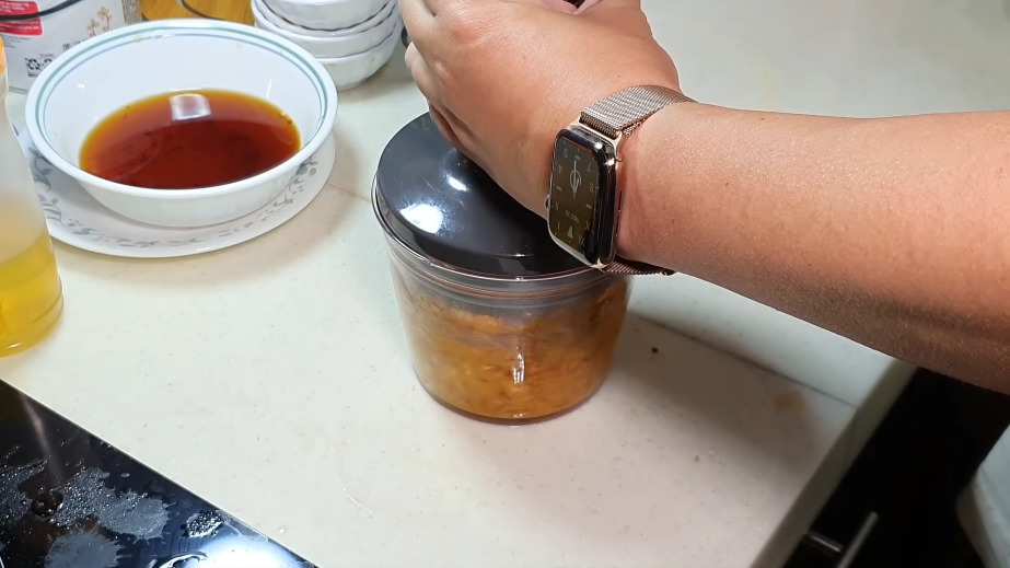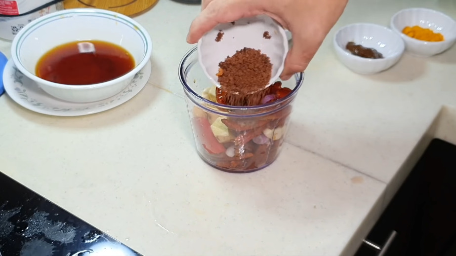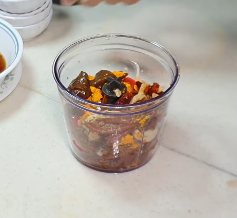 Ah Pa prefers putting oil in place of water before hitting the blend button, because it will take less time to saute the belacan later. The oil might seem excessive, but the amount of oil used later on in the wok can be reduced to make up for it.