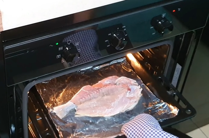 To prepare, preheat the oven for at least 10 minutes from 230 to 250 °C. Put aluminium foil on the oven tray, with the shiny side facing up and a thin layer of oil on top. Then put the skinned fish facing down, pushing the fish around to soak up the oil before setting it down in the middle. Top it off with a bit more oil.