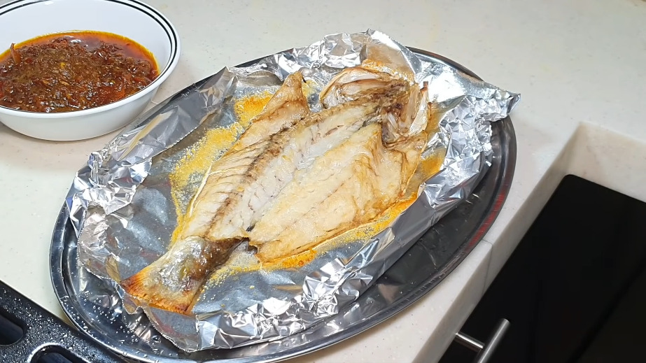 Now, it's time to grill the fish, Ah Pa is cooking ikan senangin (threadfin) that's been butterfly-cut and marinated with a bit of salt. While the recipe calls for using an oven, he makes sure to remind us that it is A-OK to pan-fry the fish.