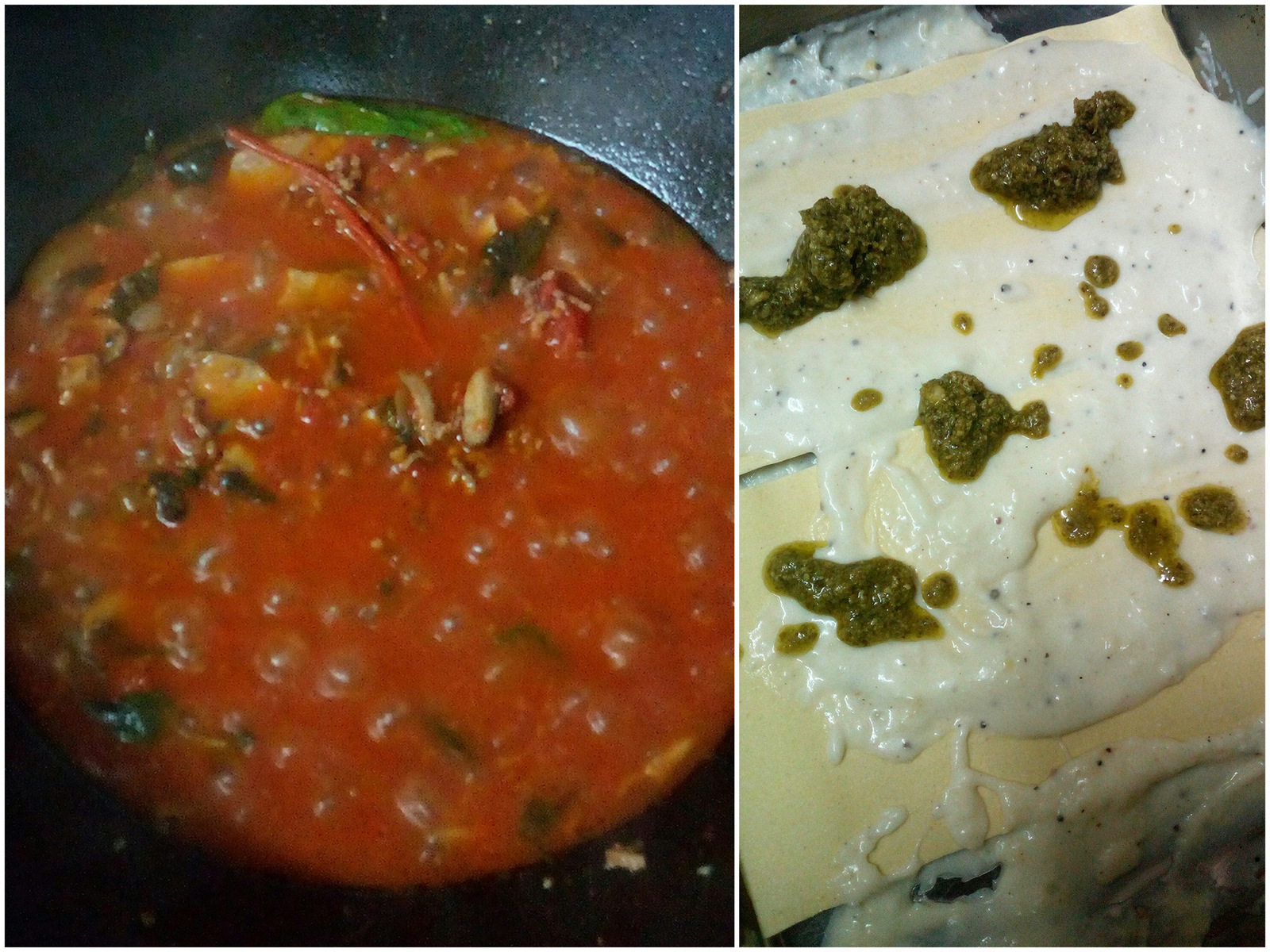 3. Lay a pasta sheet, ladle over white sauce, drop teaspoons of pesto all over. Lay another sheet of pasta, pour a ladle of the red sauce and layer with pasta. Repeat the white layer with pesto and alternate with red sauce till you finish layering in the tin. You should finish with white and red sauce covering the top.