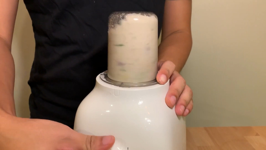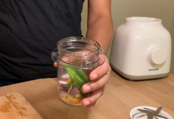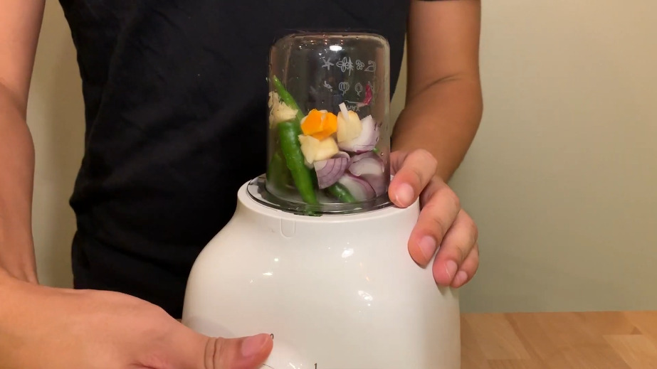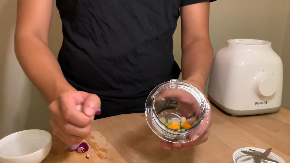 Put everything you worked on - except the turmeric leaf, as well as some of the shallots and garlic - into the blender, add a little water, and blend it till you get a slightly watery consistency.