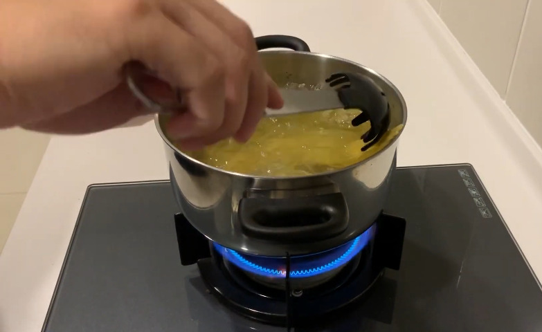 Time to work on the spaghetti. Put some water on a stove and sprinkle salt generously. Toss in the spaghetti once the water is boiling and make sure it goes under.