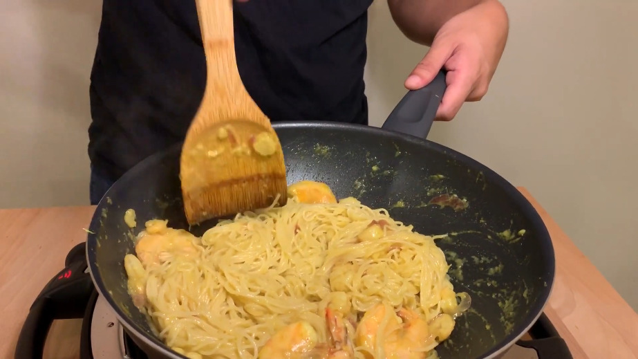 It's time to throw in the spaghetti. Keep stirring till the spaghetti soaks up the sauce. You're ready to serve!