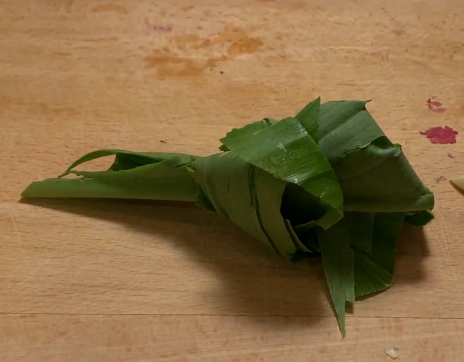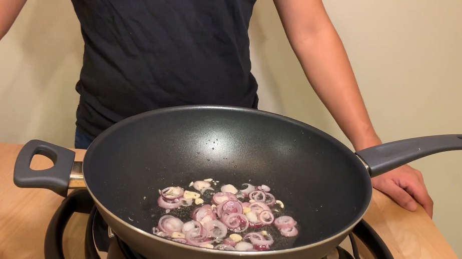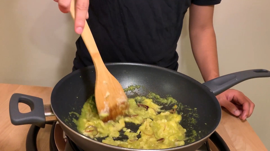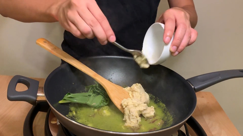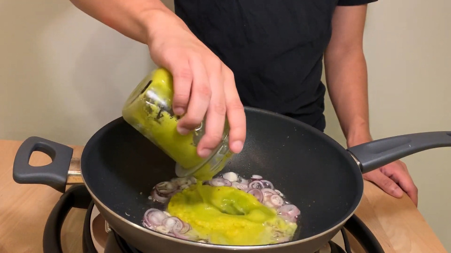While the spaghetti is cooking, put some oil in a pan and turn the heat on. Make sure it's hot, then put in the remaining shallots and garlic. Stir until it becomes a little translucent, then add your blended paste and the turmeric leaf.