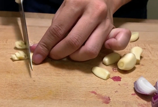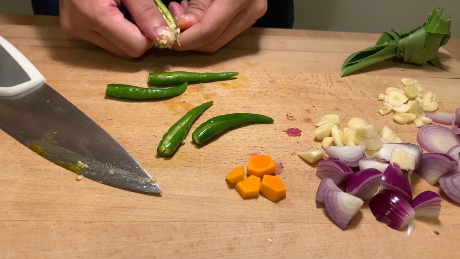 First, portion some shallots and garlic. Cut the shallot into small cubes, mince the garlic, chop up the turmeric. Also fold the turmeric leaf, and remove the seeds from the chillies for a less spicy dish.