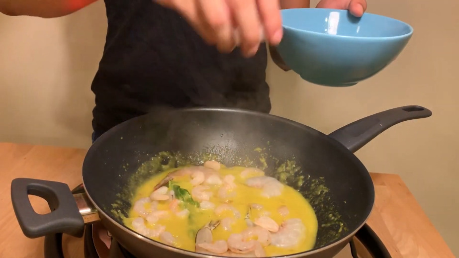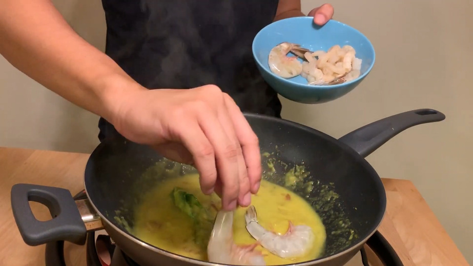 Finally, add the durian pulp - perhaps around three tablespoons - and stir, stir, stir! If it's too thick, add water and continue stirring. Once the sauce is at your preferred consistency and it's bubbling, put in the prawns. Continue stirring until the prawns are pink and cooked.