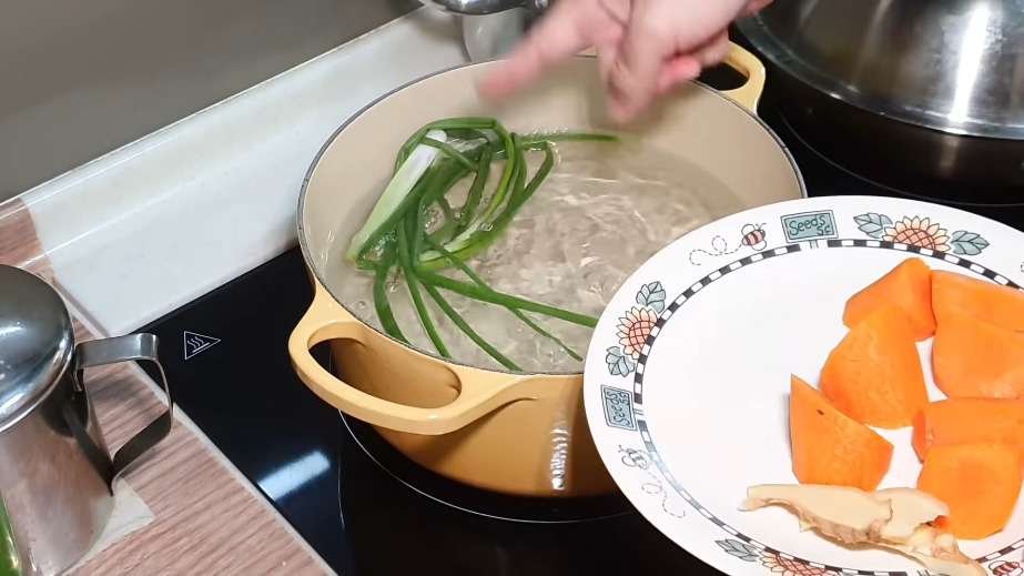 Batch One - vegetables: Green onions, red carrots, and sliced ginger. Cooking Ah Pa also recommends adding white radish or big onion to the mix, but he says you can use pretty much any vegetables.