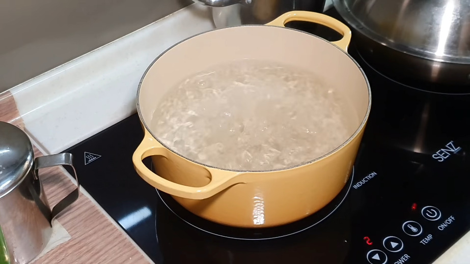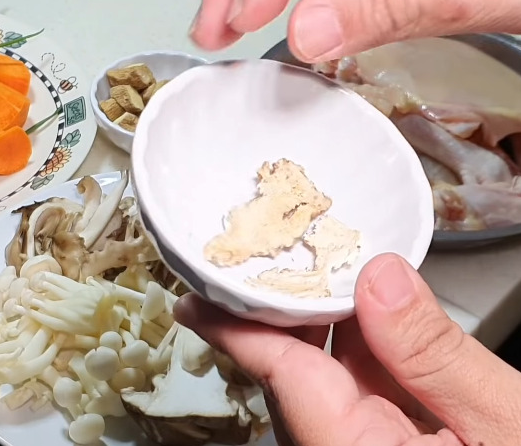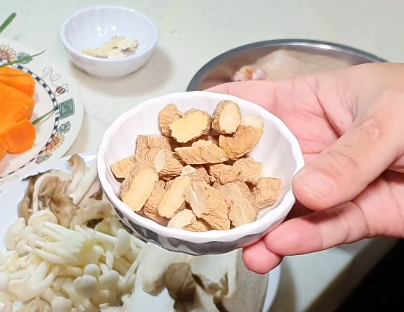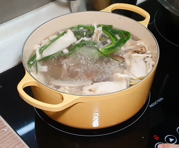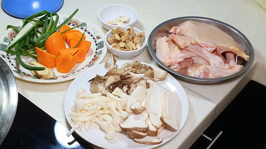 Wash the ingredients properly. Bring about two to three litres of water to boil. Put in the vegetables, then the chicken, then the mushrooms. Finally, put in the herbs.