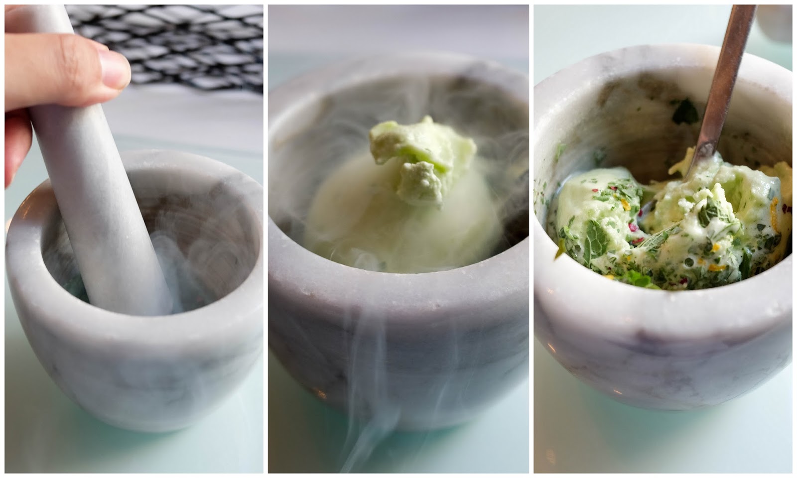 ... cucumber sorbet with basil, mint & rose petals; white chocolate with warm berry consomme & thyme; & much more.