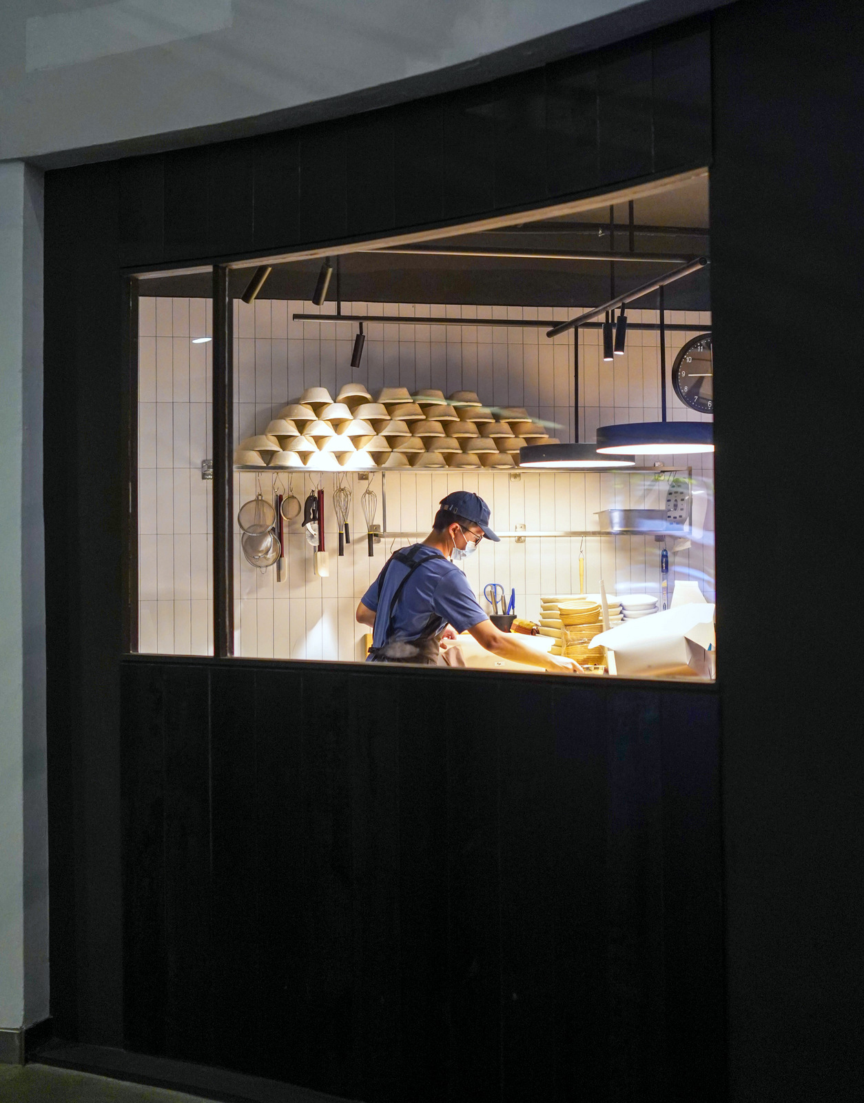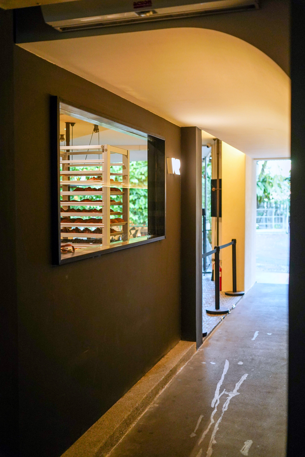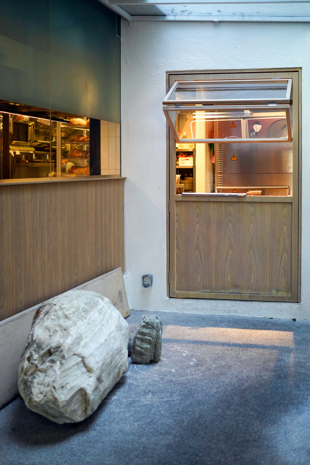 Nearly everything inside is reserved for baking, with a narrow walkway connecting to pastry displays orchestrated in a slant, punctuated with a cobbled flooring finish. Windows intimately peek into various work, from pastry baking to coffee brewing.