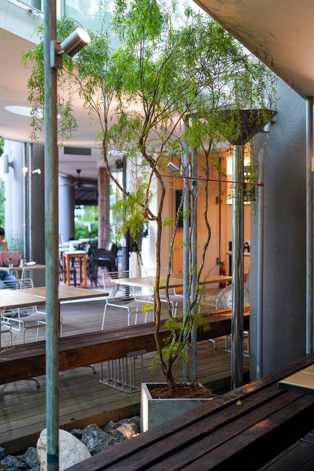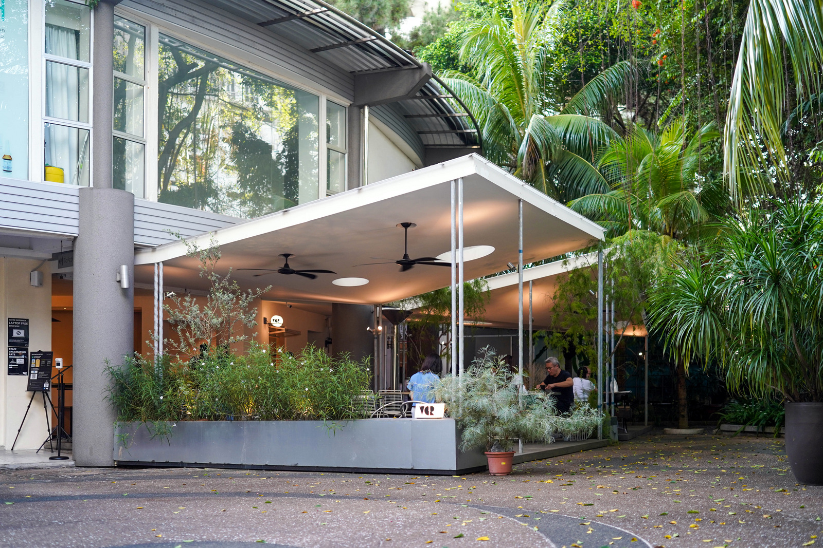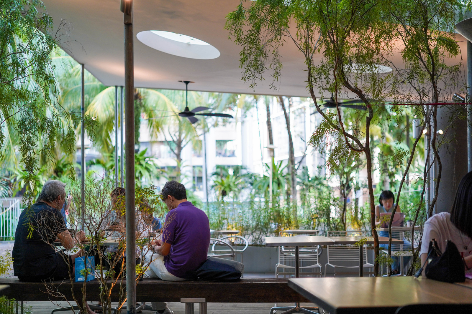 Outdoor tables are spread under a geometric ceiling, its roof with circular perforations for natural light. Matured trees such as willows flank the seats, evoking a Copenhagen-style streetscape of community.