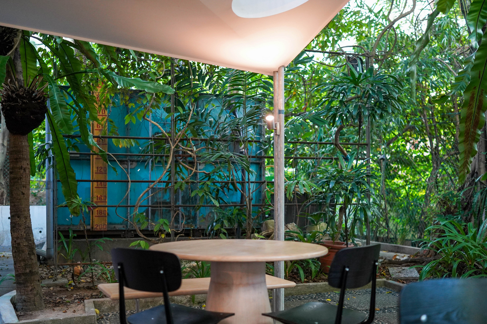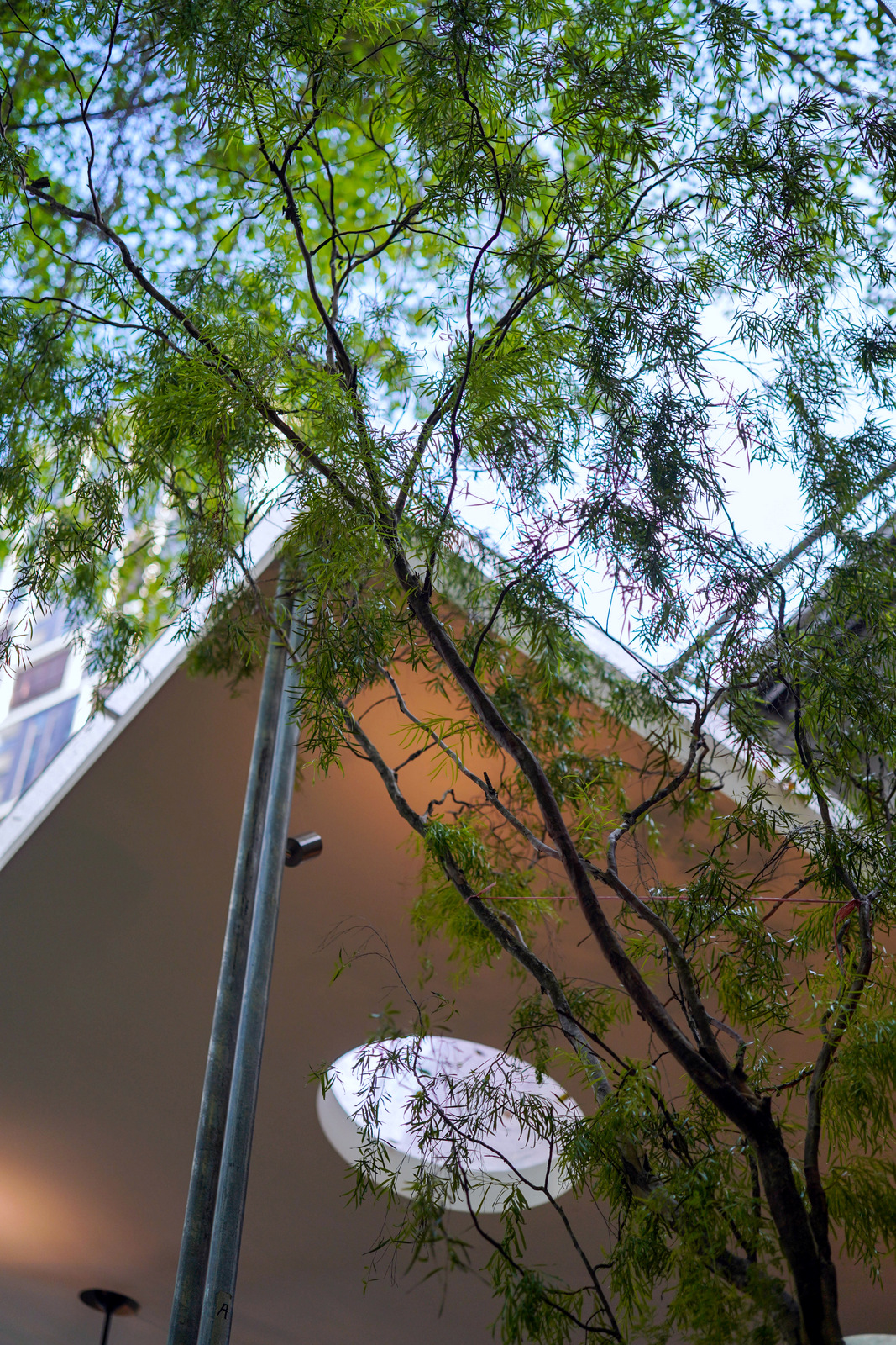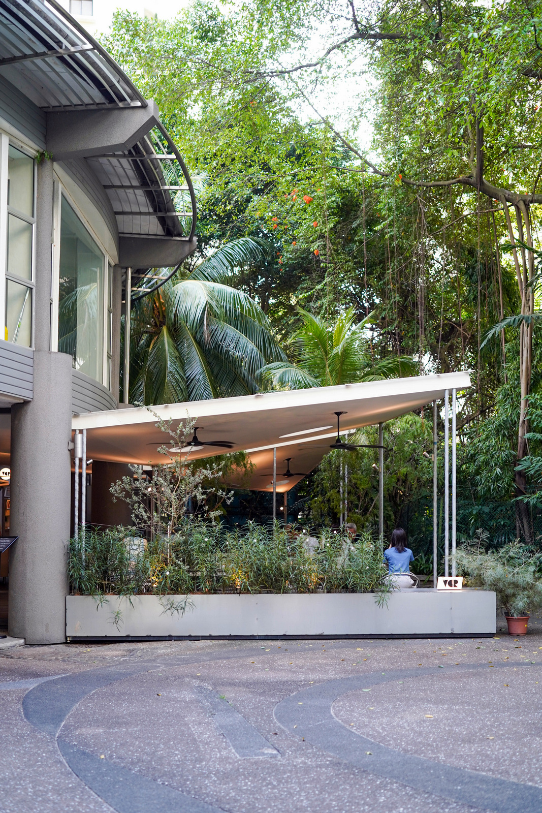 Outdoor tables are spread under a geometric ceiling, its roof with circular perforations for natural light. Matured trees such as willows flank the seats, evoking a Copenhagen-style streetscape of community.