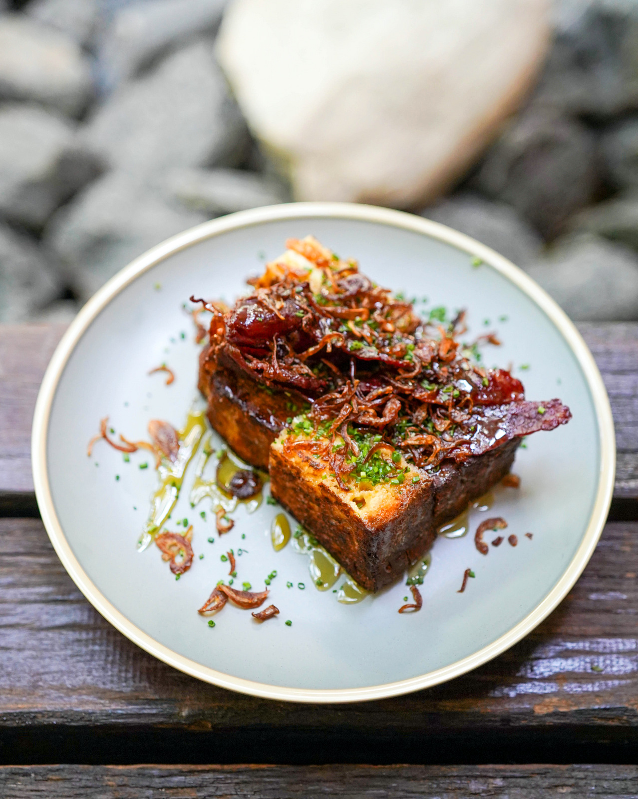 The Bakehouse French Toast takes a Southeast Asian risk - the chunky, hunky brioche turns savoury not only with whipped cream cheese and streaky bacon but kaffir lime leaves and fried shallots. It works!