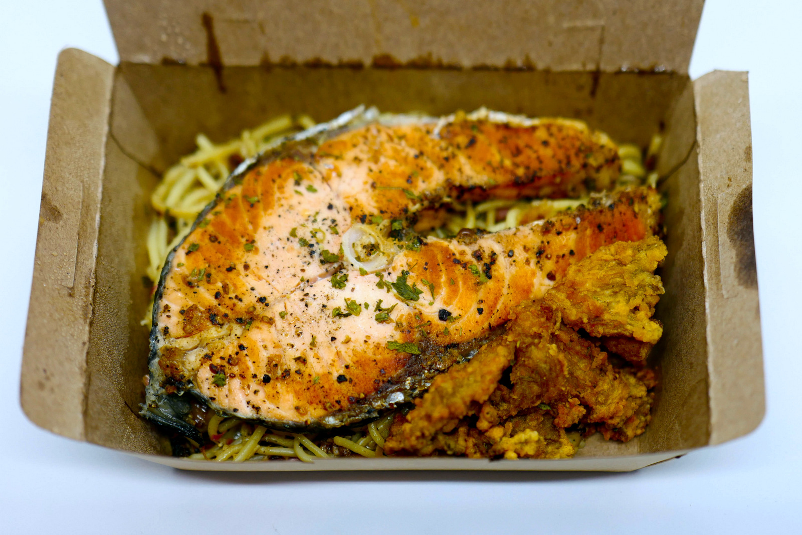 Wawan Kitchen’s Nasi Ayam Roasted Berlambak lives up to its name, with what amounts to almost a double serving of chicken with rice, cucumbers, soup and sauces (RM12). The roast chicken holds up after delivery, still warm and juicy, slobbering with soy sauce. The chilli sauce is on the tamer side, with maybe more needed to match the portion of meat.