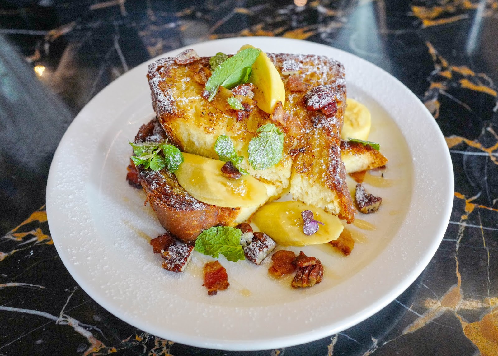 Desserts prove perfect for those calories-shouldn't-count weekend indulgence - Mezze's French toast is a winning version, a fantasy-come-true assembled to order with its fabulously fluffy brioche base, simultaneously custardy and buttery, showered with pecans and bananas for nutty-fruity fun (RM18). From the counter, bread and butter pudding, peach and banana crumble, and espresso-soaked tiramisu also beckon, alongside a boulangerie's pride of pain au chocolate and croissants, plus banana bread, pecan pies and much more to explore.