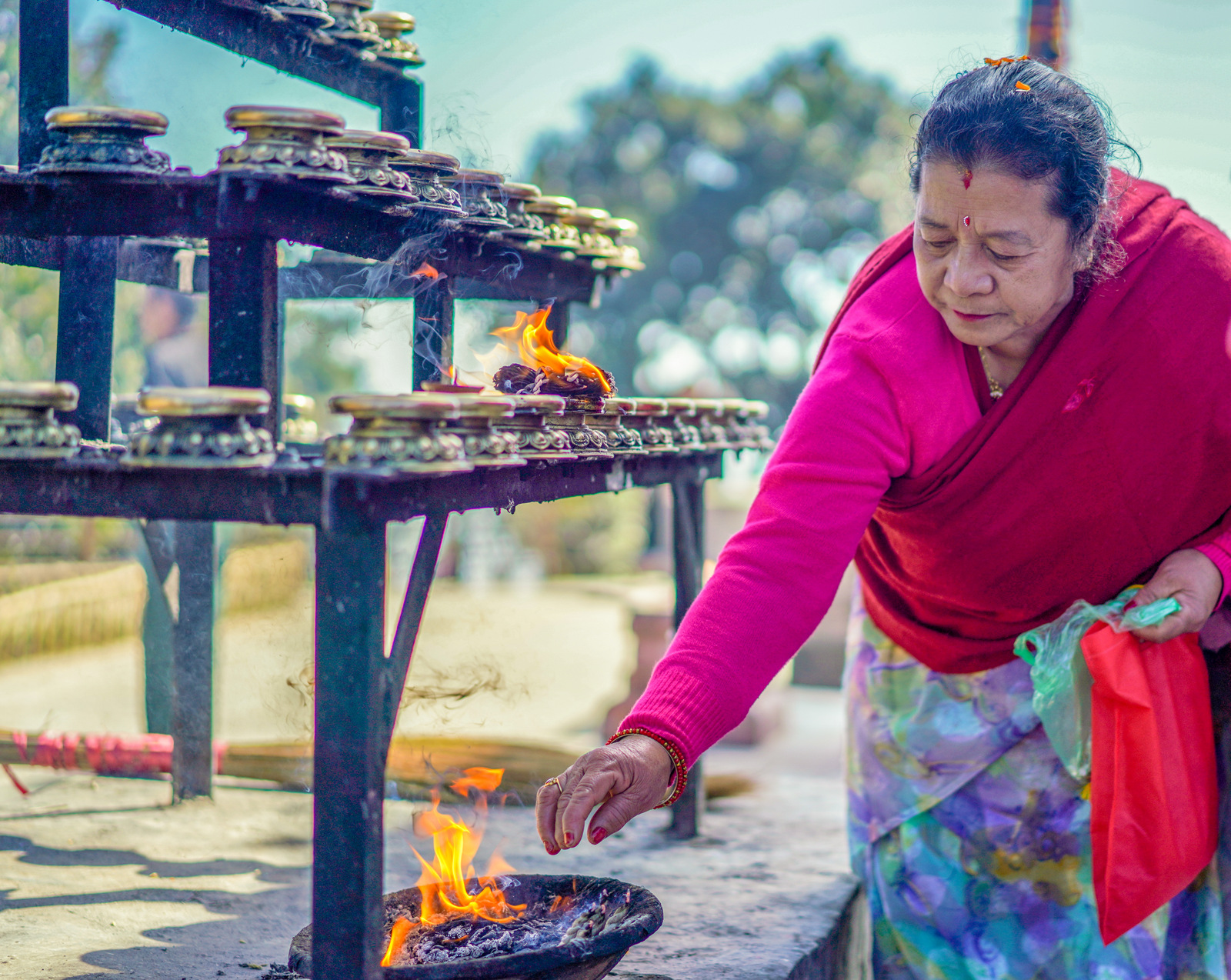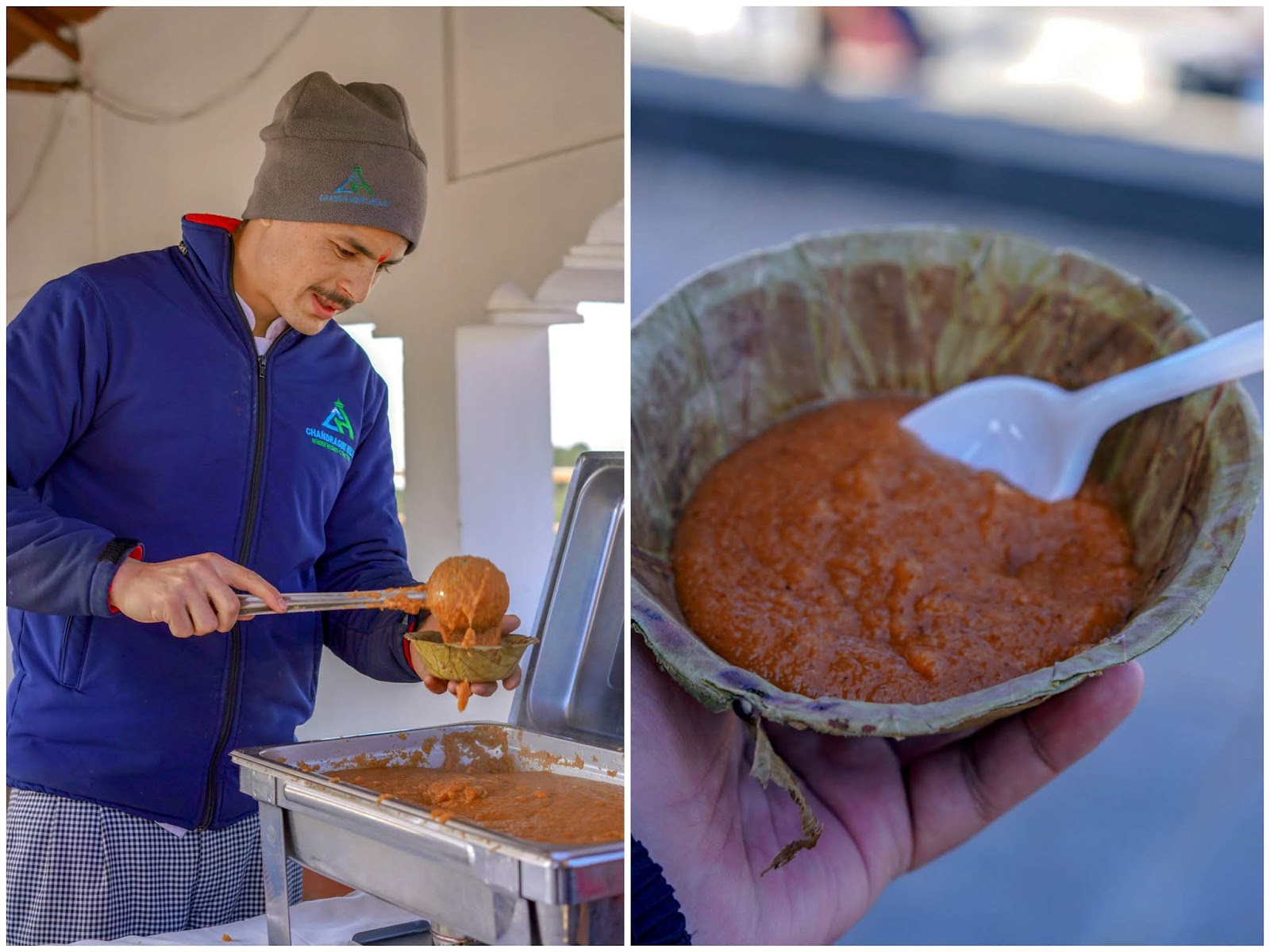 South of Kathmandu, the Bhaleshwar Mahadev temple of Lord Shiva is perched more than 2,500 metres above sea level, offering an astonishing perspective over the landscape that stretches to the mountains beyond. For Hindu festivals, devotees throng the temple and are fed by volunteers with simple meals, like warm carrot halwa, to sustain them amid their prayers.