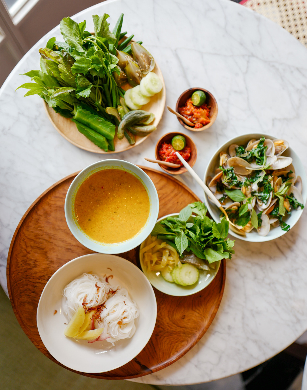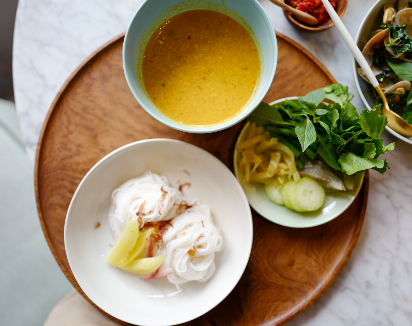 Thai treasures dominate the menu, thankfully transcending the green-curry cliches. If you love khanom chin, this is the place for the rice noodles with a mellow-tasting stock of fish and wild ginger, served alongside starfruit, rose apples and herbs for a pleasantly invigorating midday meal (RM27). Hor mok, the steamed fish custard, is available too, prepared to order for a delicately fluffy lusciousness (RM25), potentially paving the way for Cambodian, Laotian and Myanmarese recipes to eventually enter Isabel's repertoire.