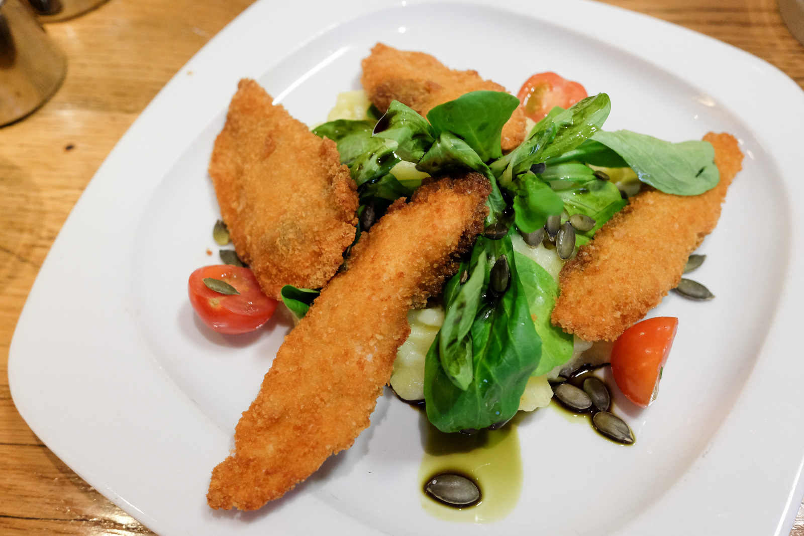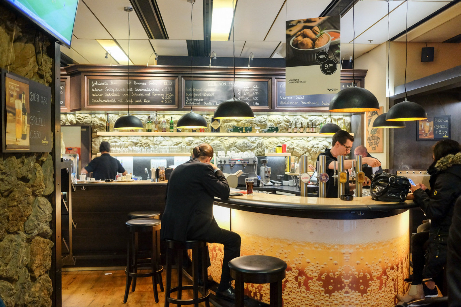Johann's Biereck gives airport restaurants a good name - warm service, bolstered by a very satisfying meal of succulent deep-fried breaded chicken with lamb's lettuce, potato mash & Styrian pumpkin seed oil. Not a shabby way to bid farewell to Austria.
