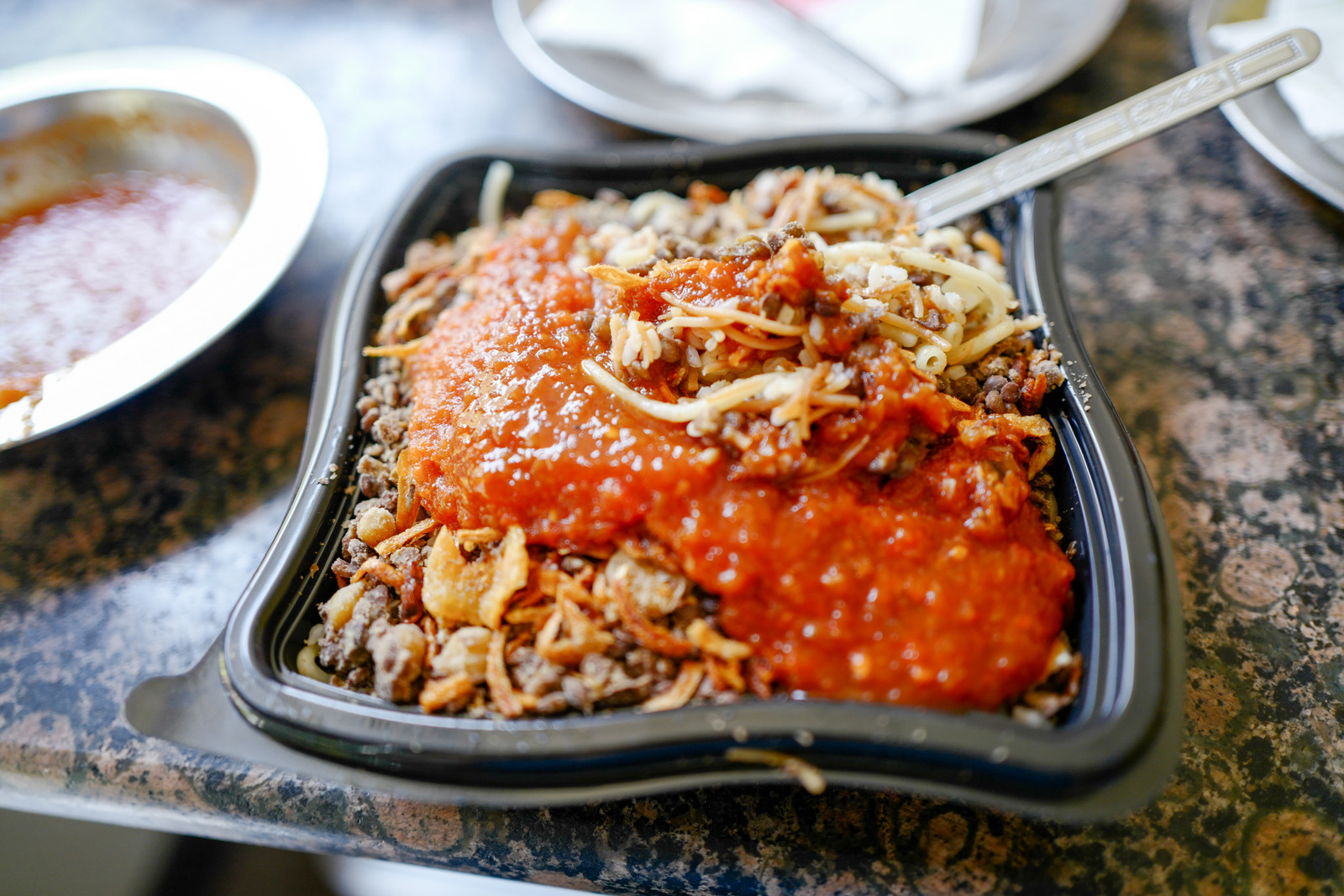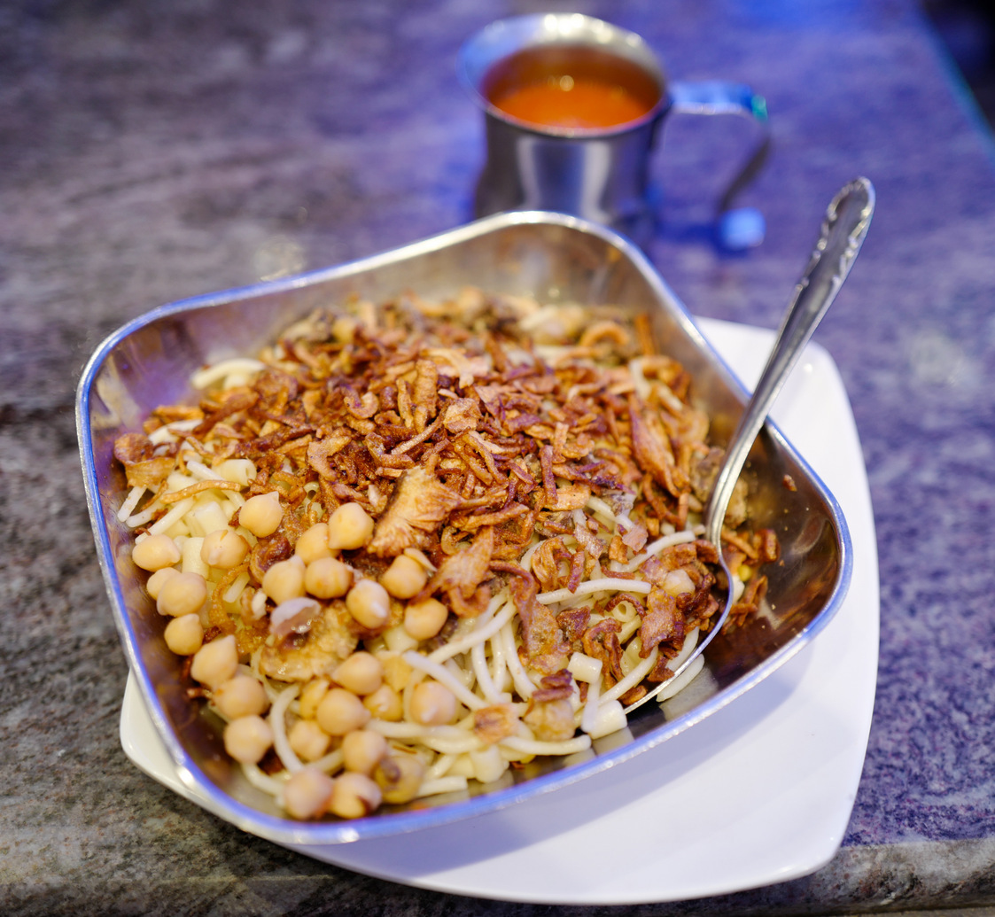 One of Egypt's most popular recipes, koshari is widely considered the country's national dish - an unlikely mix of macaroni, lentils and rice, jazzed up with cumin-spiced tomato gravy, garlic vinegar and optional hot sauce, garnished with chickpeas and crispy fried onions.