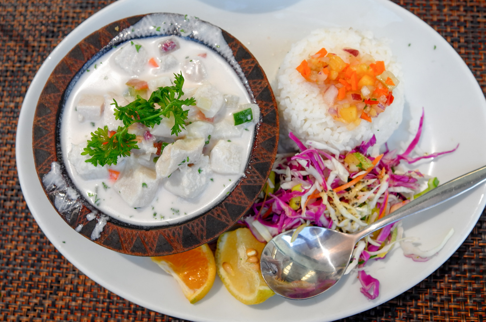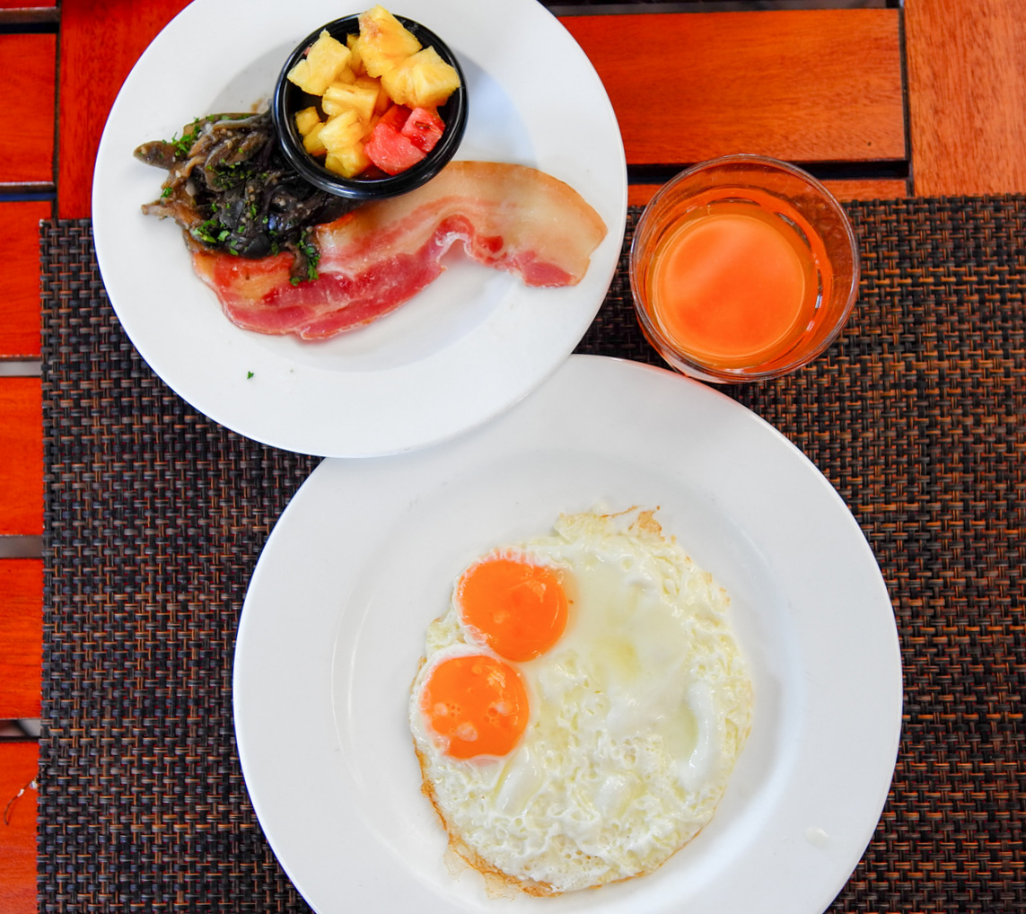 A hearty lunch of Fijian kokoda (the catch of the day prepared with fresh coconut cream), battered fish with cassava chips, and pumpkin risotto with chicken hits the spot after a long hike over the hills of Nacula, one of the farthest-north islands of Fiji's Yasawa archipelago.