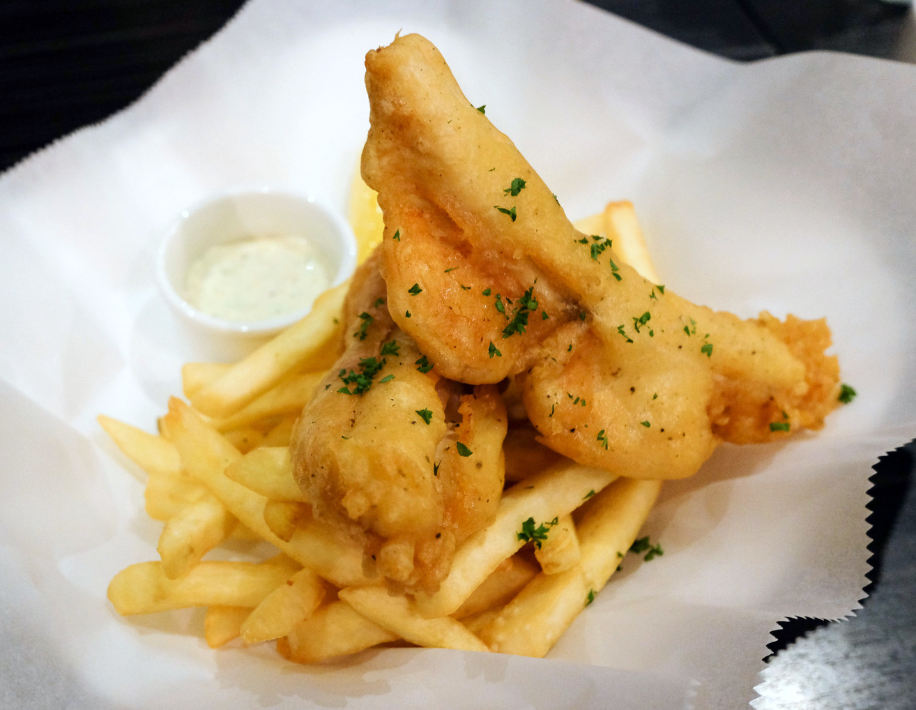 ... then making waves with the pan-fried barramundi, flaky & juicy, with grilled eggplant & lemon butter basil sauce (RM36) & irreproachable beer-battered butter fish & chips that do chunky justice to this traditional British crowd-pleaser (RM30) ...