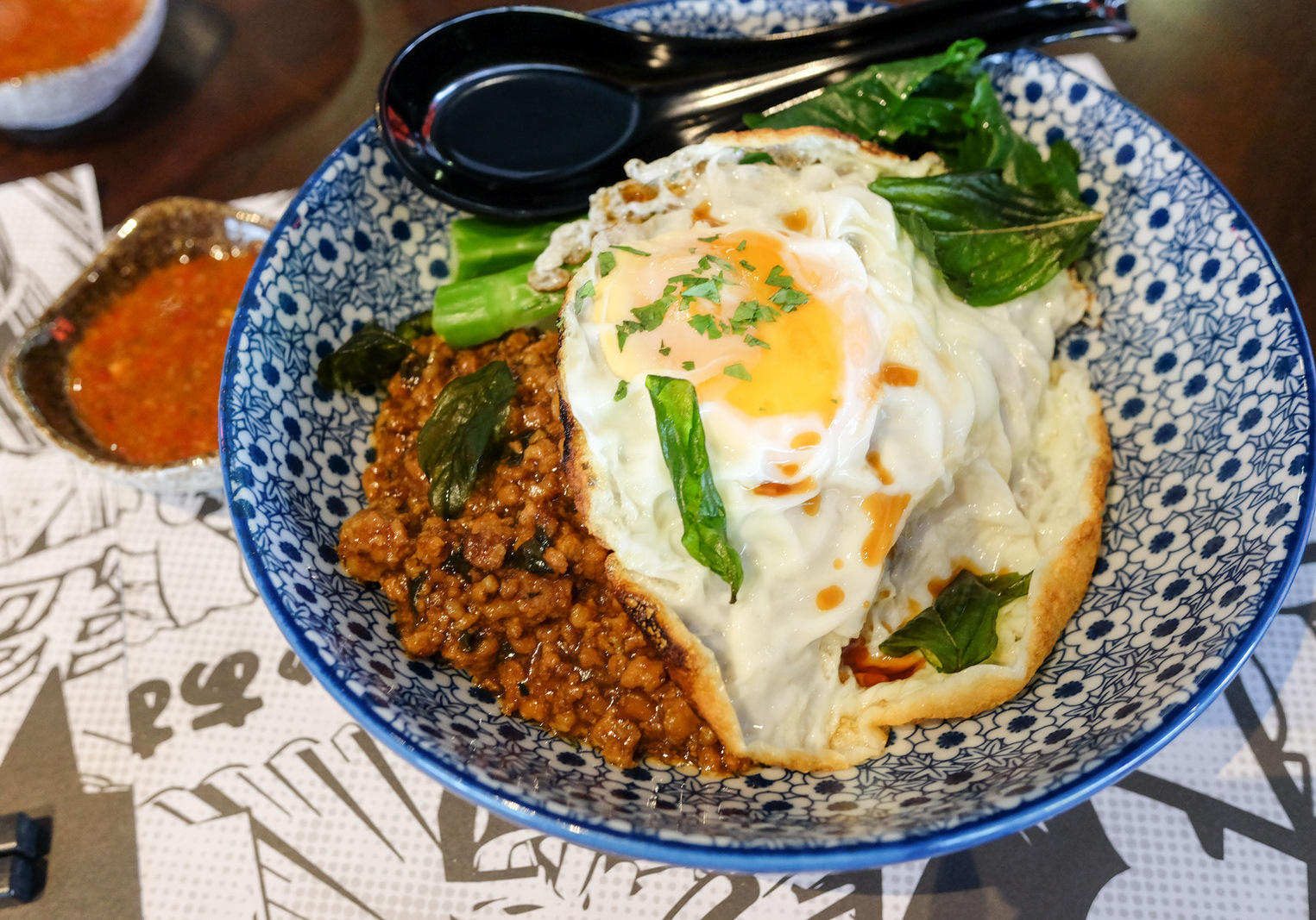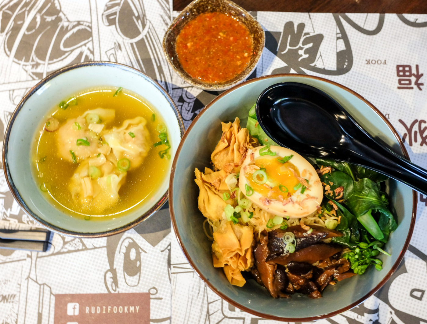 Soul food, bowl food: Wantan mee is the cornerstone of Ru Di Fooks repertoire - noodles with three fried pork wantans, three boiled wantans in a beautifully sweet scallop soup, half an onsen egg & kailan clock in at RM15.80 for a well-executed meal with a tasty kitchen-made chilli sauce. But if you prefer rice, the serving with three-cup ground pork, Thai basil & a crispy-frilled fried egg (RM17.80) supplies warm, satisfyingly hearty comfort too.