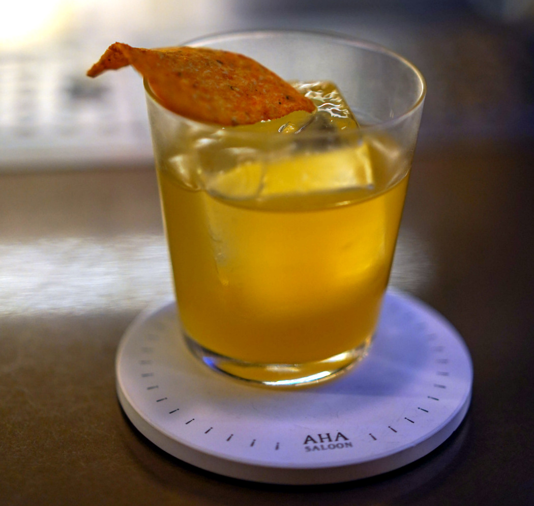 Aha Saloon's Cigarettes After Sex (Vetiver Vodka, Pelargonium Distillate, cinnamon, ginger, tobacco kombucha) and Evil Feast (Toon Tequila, Doritos, butterscotch, truffle honey, mustard Cointreau, cucumber bitters) ...