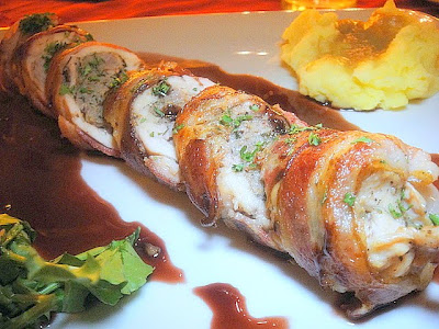 These are "Chic Pogs" _ chicken thigh stuffed with pork sausage & wrapped in bacon. If that sounds like your kind of dish, then let's just say it tastes as terrific as it sounds.