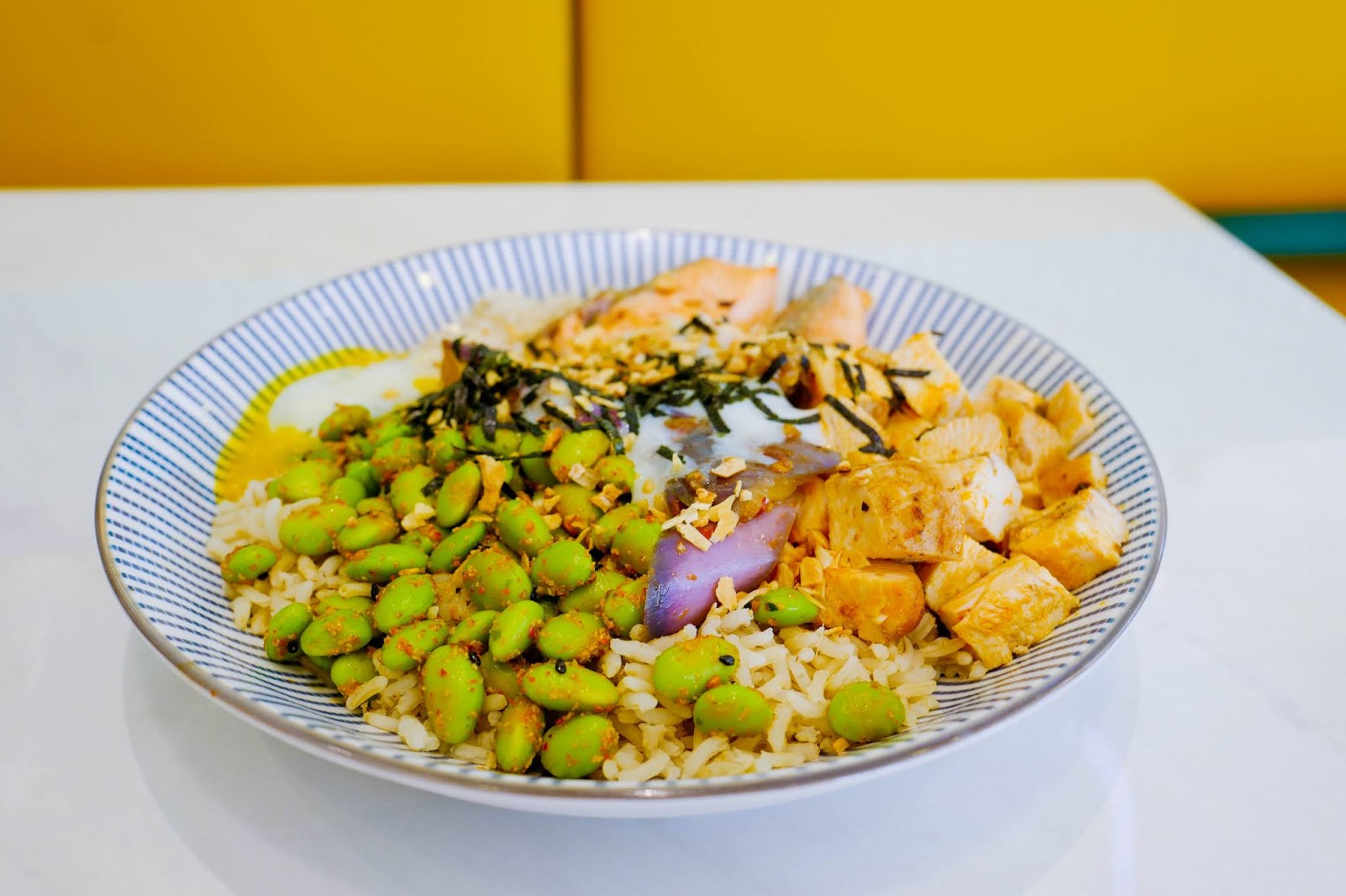 This large bowl, assembled to order, comprised a double dose of protein: Portuguese-inspired piri-piri chicken breast and crispy-skinned salmon, heartily blanketing a bed of brown rice, bolstered by an onsen egg, some spicy edamame and eggplant for an edge of heat, plus shredded nori, crunchy garlic and soy-lime-cilantro sauce for extra zing and zest.