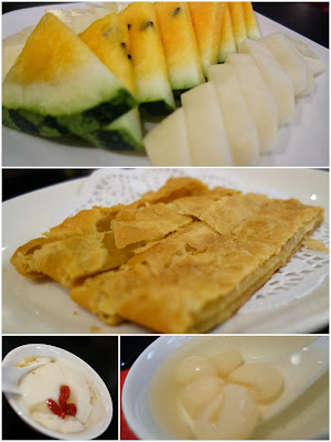 Watermelon & honeydew, Chinese pancakes (too doughy), bean curd with wolf berries, longan with inexplicably nonexistent lotus seeds (served sadly at room temperature instead of cold).