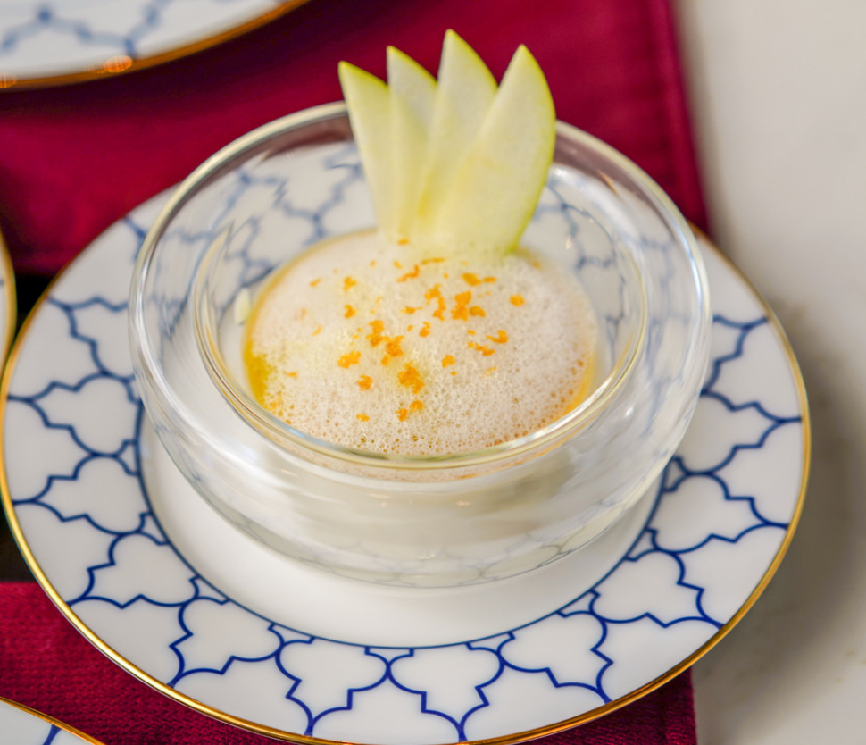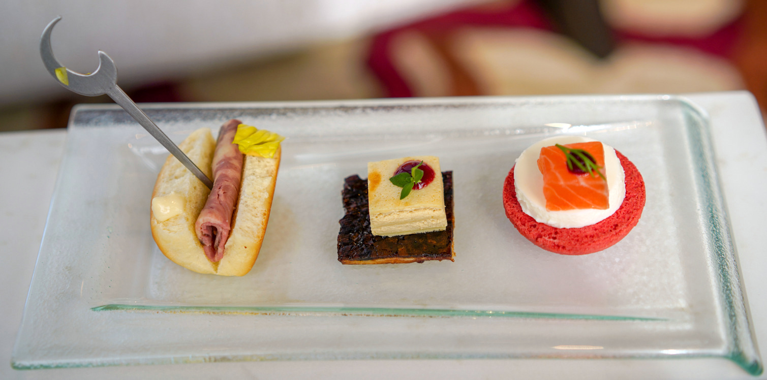 A slew of savoury tidbits surface one by one, enabling guests to slowly devour each delicacy without feeling hurried, at the ideal pace for an afternoon of companionship with loved ones. Every offering is a conversation piece in its own right, from the roasted beef sandwich with horseradish sauce to the pancake-coated foie gras with Banyuls shallot, the beetroot macaron with house-cured Atlantic salmon with dill and sour cream to the sea urchin cream with Granny Smith apples and shaved bottarga to the curry cappuccino with crab meat grissini, ginger and lemongrass (no fear; each person receives an individual serving).