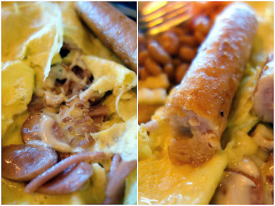 The big breakfast is basic but it isn't bad; there's a plump sausage, plus a substantial omelette (more egg! it's all about the albumin for this entry) stuffed with cheese & more sausage meat, partnered with baked beans, fries, toast & a salad. RM18.