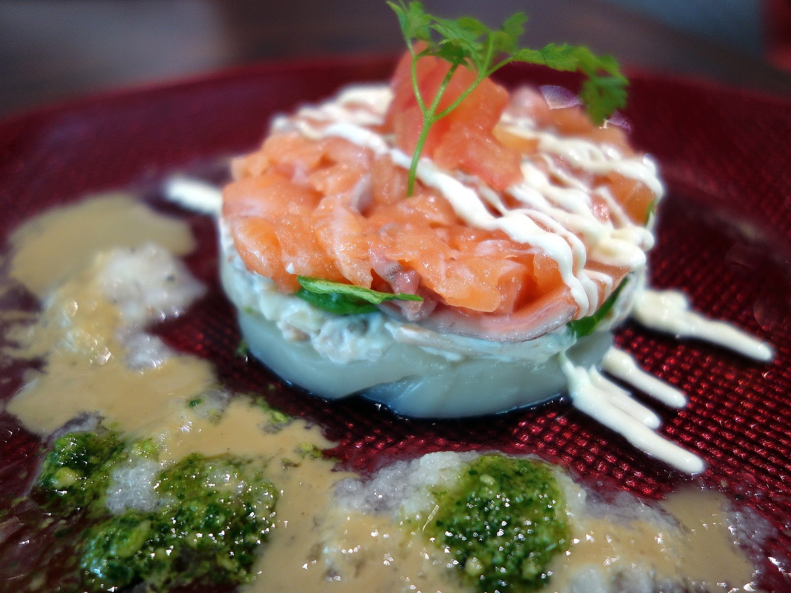 Comfort-food tartare of salmon, avocado & scallop layers with creamy wasabi sauce. RM25.