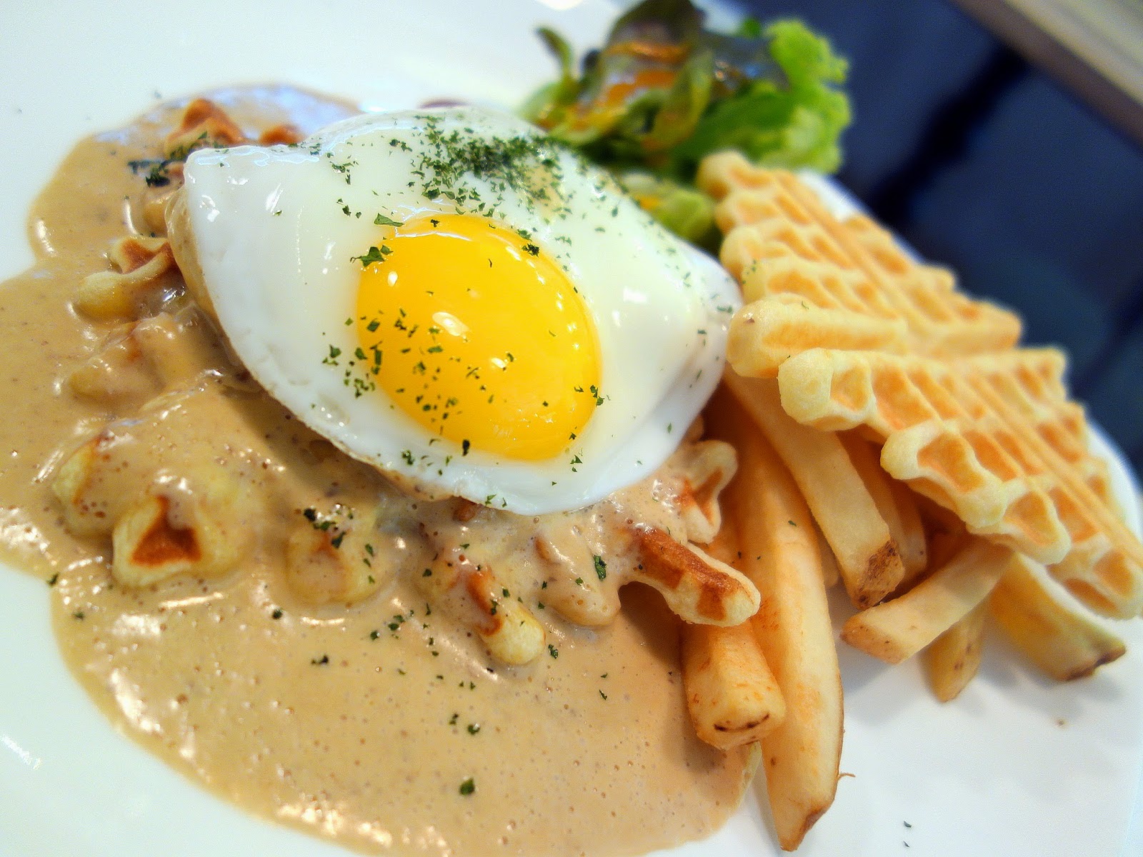 ... to savoury waffles with another temptingly runny egg, grilled chicken, melted cheese, mushroom sauce, fries & a side salad (pretty hearty comfort food; the sauce is a little one-dimensional in flavour, but this feels reasonably priced at RM15.90) ...
