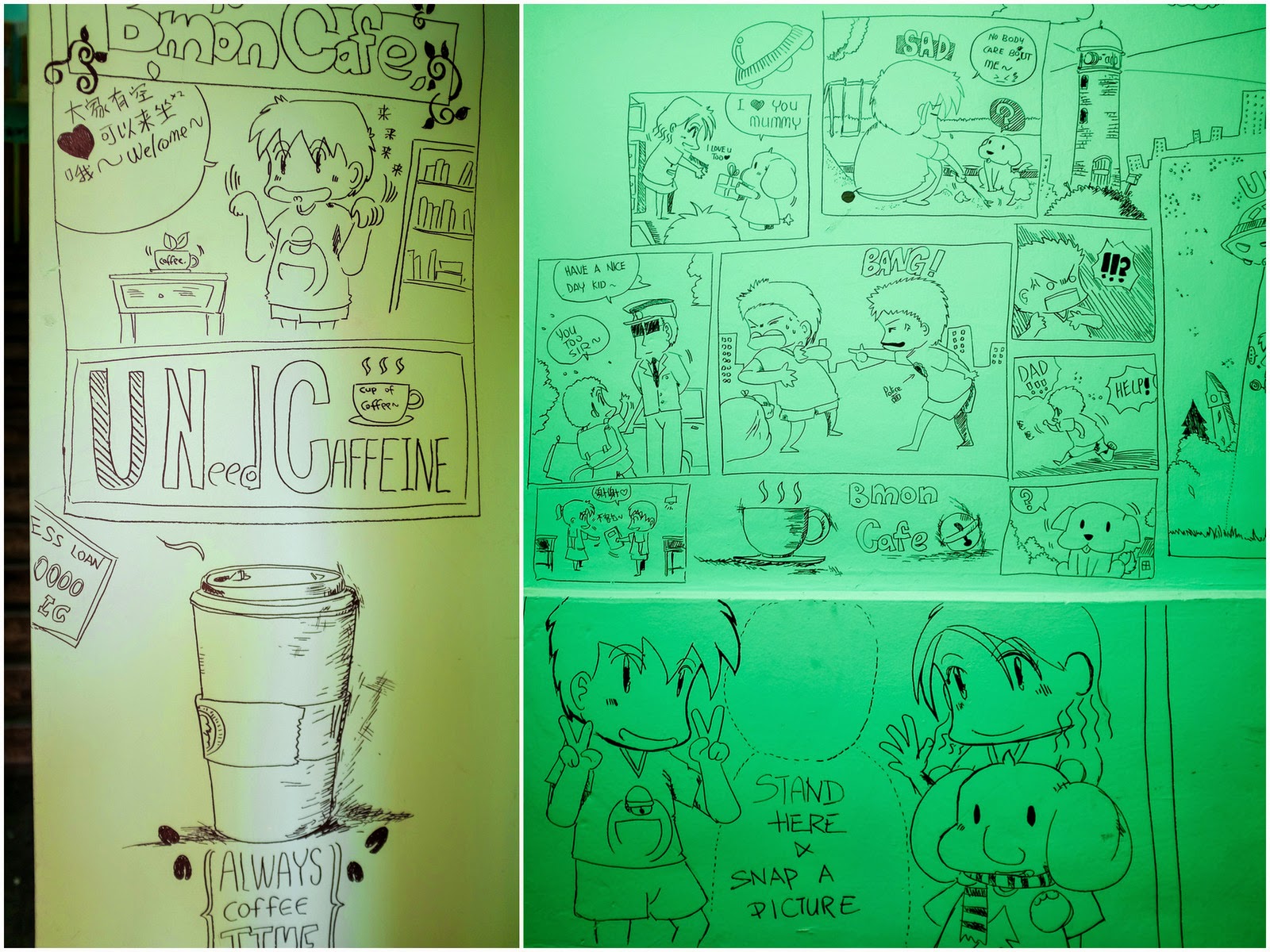 The story of Bmon, his girlfriend Mel & their pet elephant is showcased all across the cafe's walls, including beside the stairs that lead up to this first-floor venue. Bmon T-shirts, a cool collectable, are available for sale too.