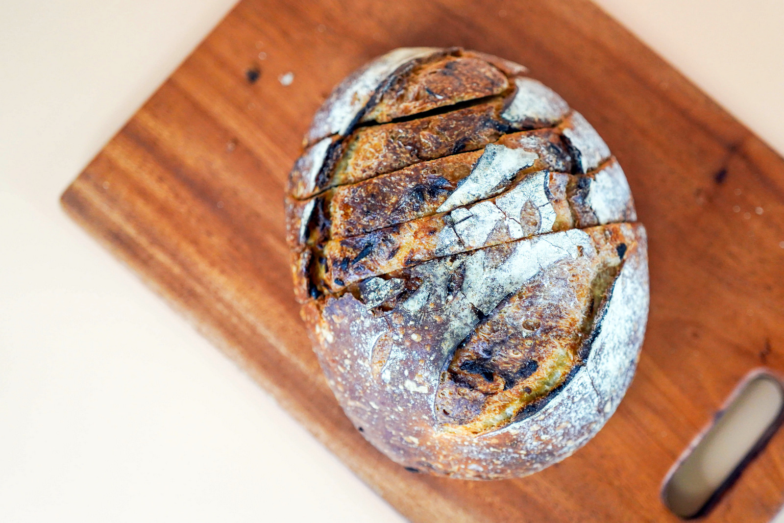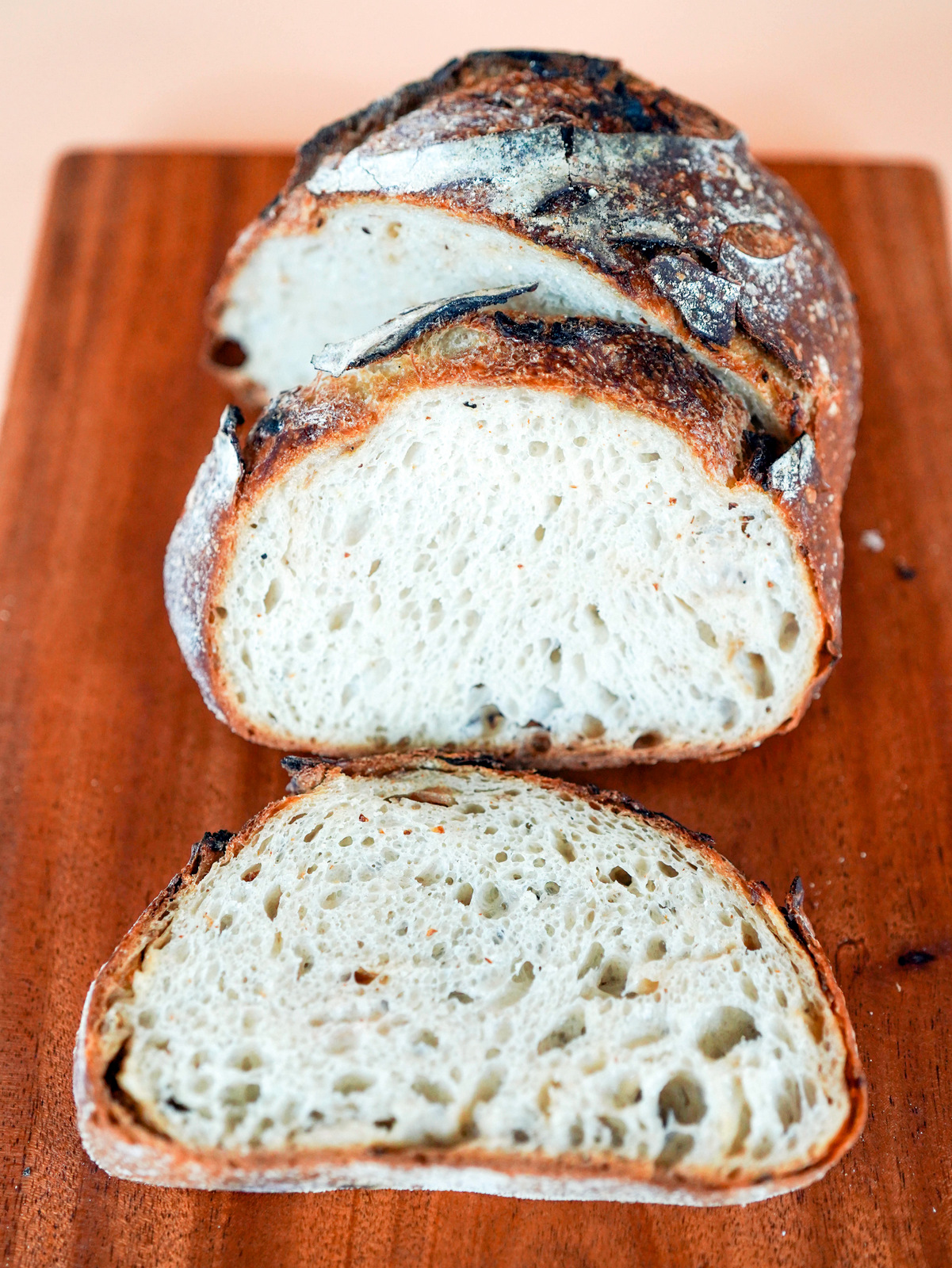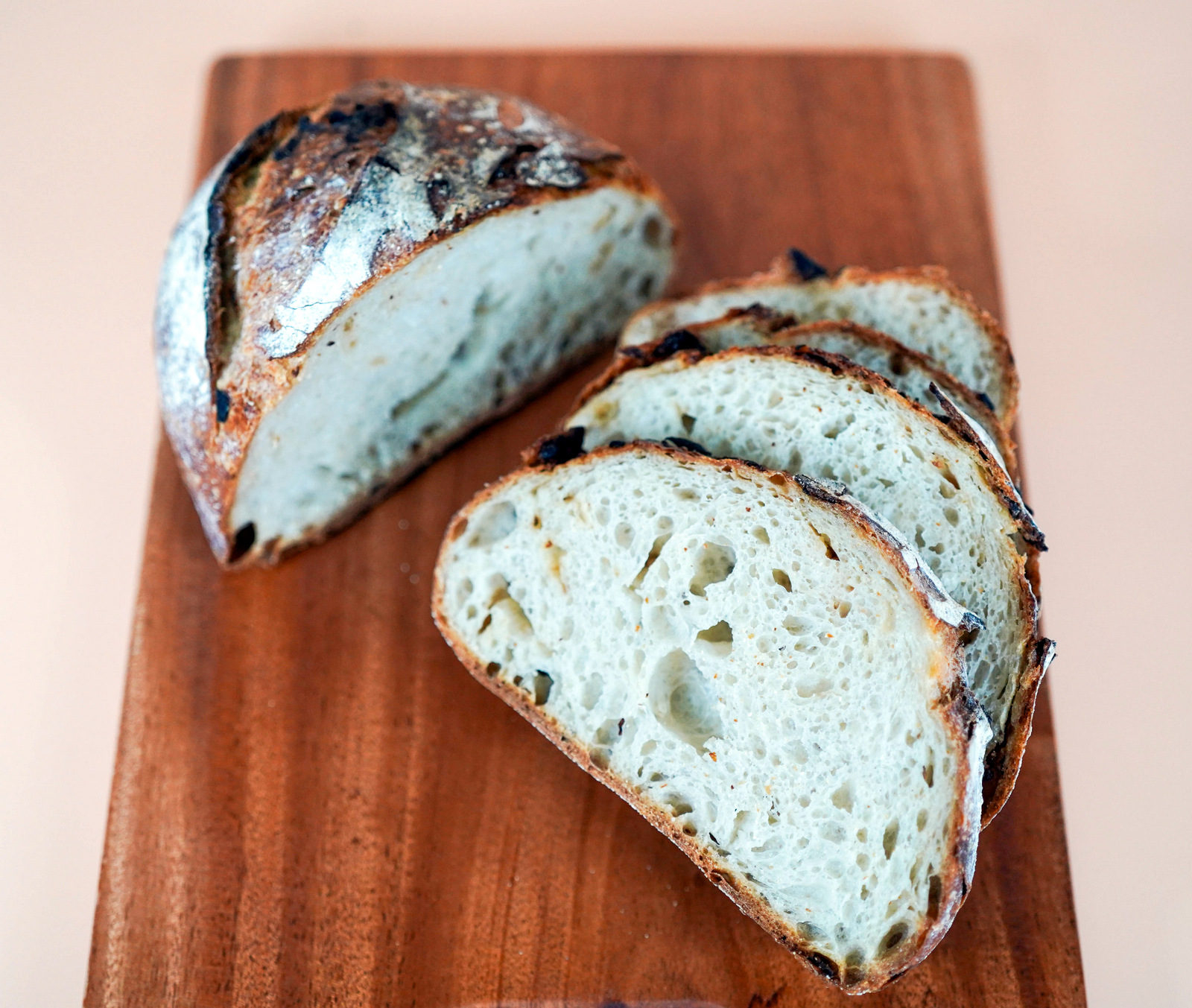 The flavour of the bread is altered but not overpowered - the trademark tang of sourdough stays intact, punctuated with new subtleties. These loaves are a textural triumph too, artisanally scored, their firm crust ceding to a fluffy-stretchy crumb.