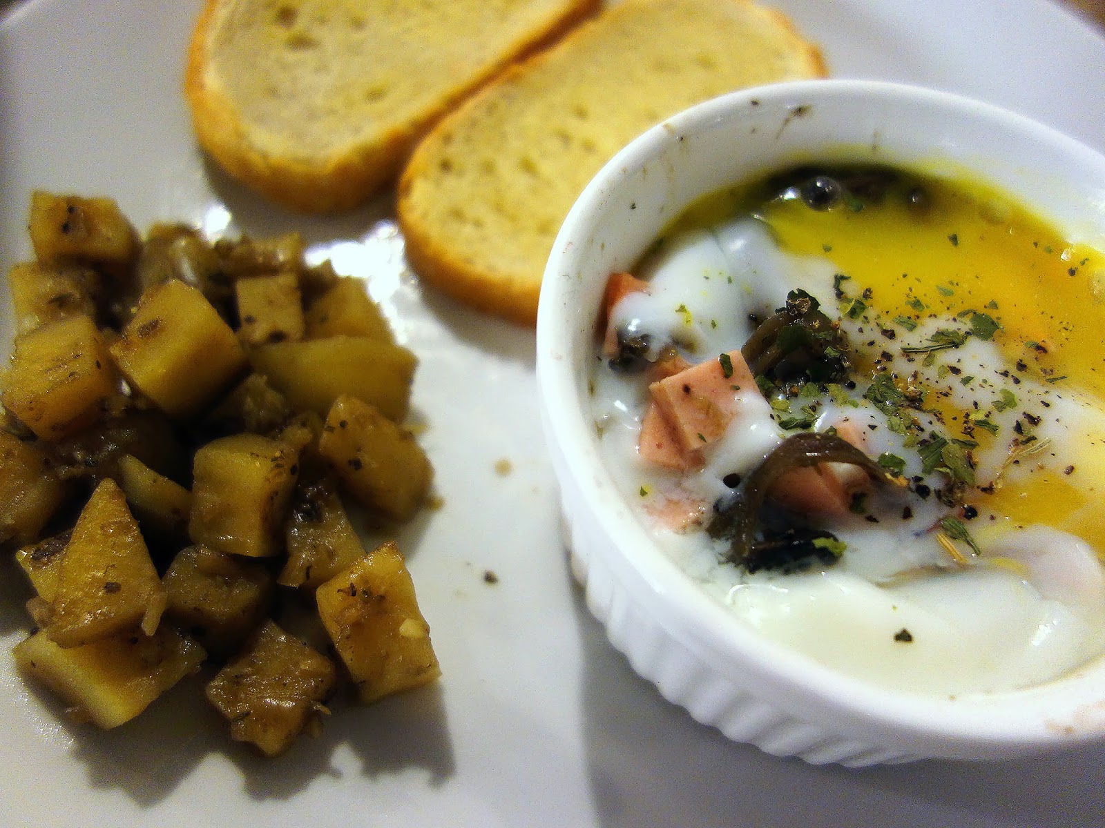 Baked eggs, nice & runny, though the slices of sausage meat inside are inferior. Good accompaniment of potatoes though.